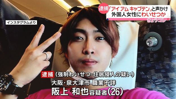 留学で来日したばかりの女性に「アイアムキャプテン阪上」「道案内するよ」と声をかけ、女性が予約していたホテルで犯行に及んだ疑い。「無理やりではなかった」と容疑を否認している。