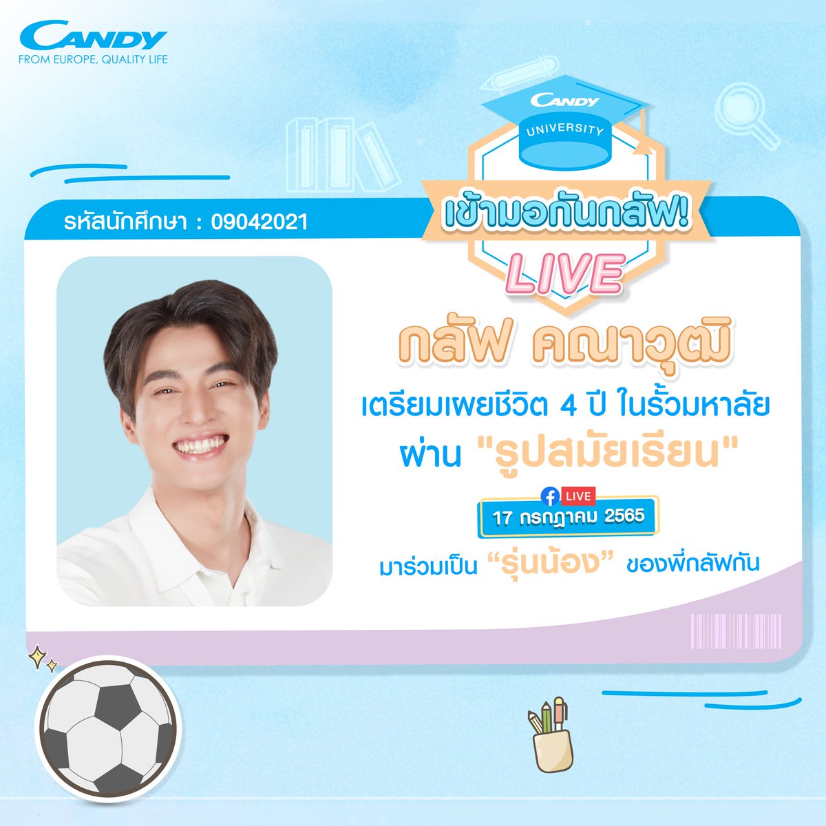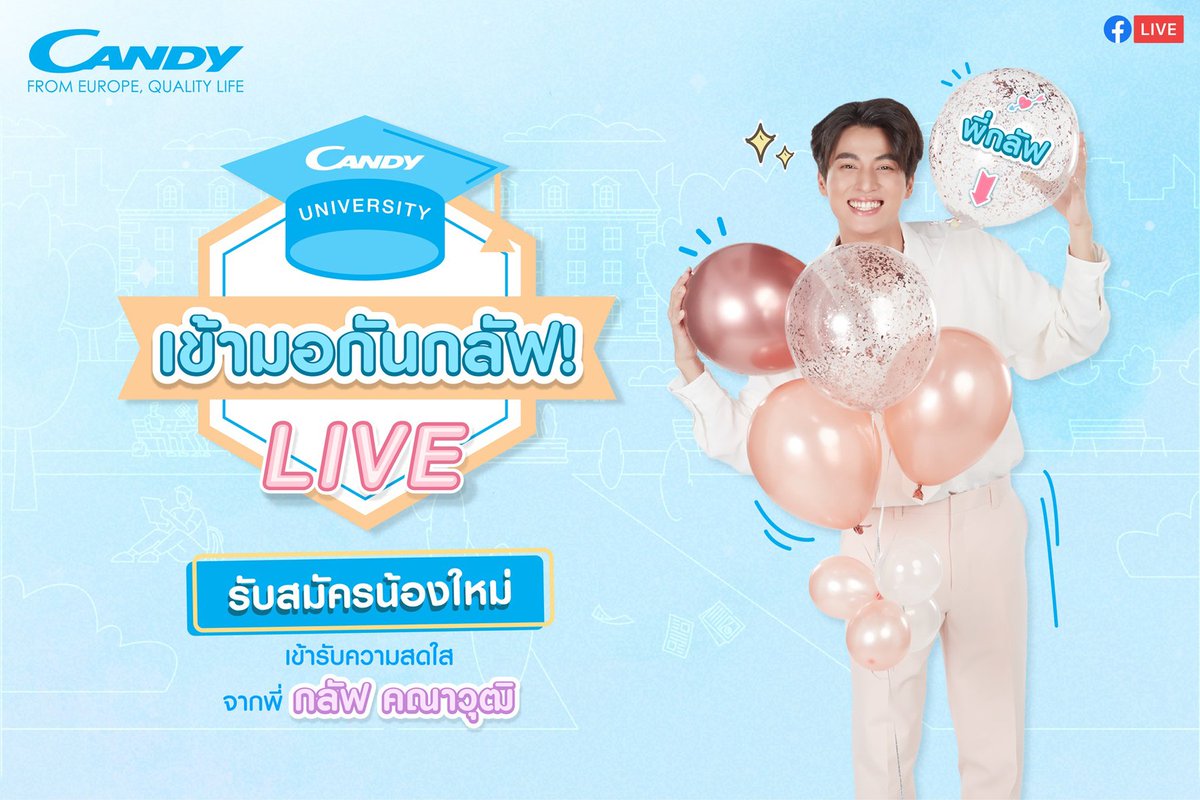 แคนดี้ ชวนรุ่นพี่ “กลัฟ คณาวุฒิ” ย้อนวัยมหา’ลัย พร้อม 10 รุ่นน้องคนพิเศษ ร่วมสนุกกิจกรรม ไลฟ์! สุดบันเทิง “เข้ามอกันกลัฟ Live”