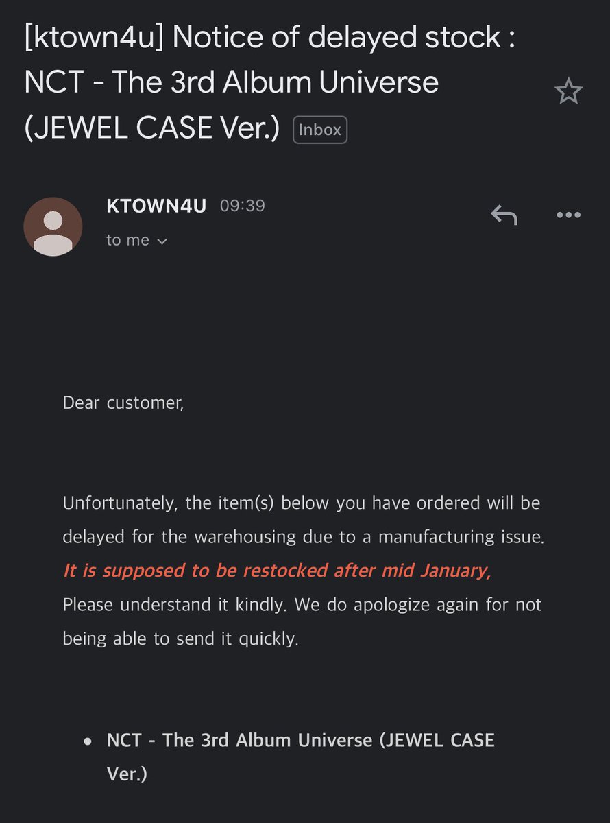 Ktown แจ้งว่า อัลบั้ม Universe Jewel .Ver จะทำการ Restocked สินค้า หลังจากช่วงกลางเดือนมกราคมค่ะ