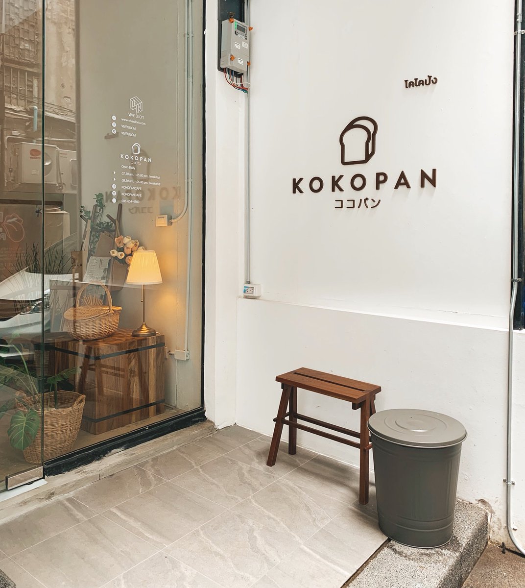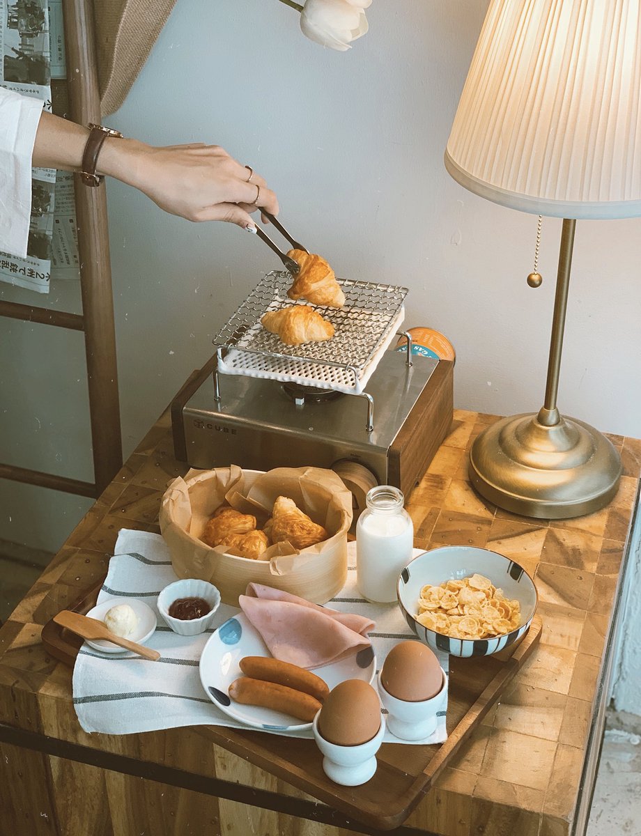 คาเฟ่ย่านสีลมในโฮสเทล VIVE silom สไตล์ญี่ปุ่น แต่ก็มีความเกาหลี มีที่ปิ้งครัวซองน่ารักๆ ที่จัดมาเป็นเซท พร้อมซีเรียลกินกับนม แฮมและไข่ เครื่องดื่มก็มีขายน้า