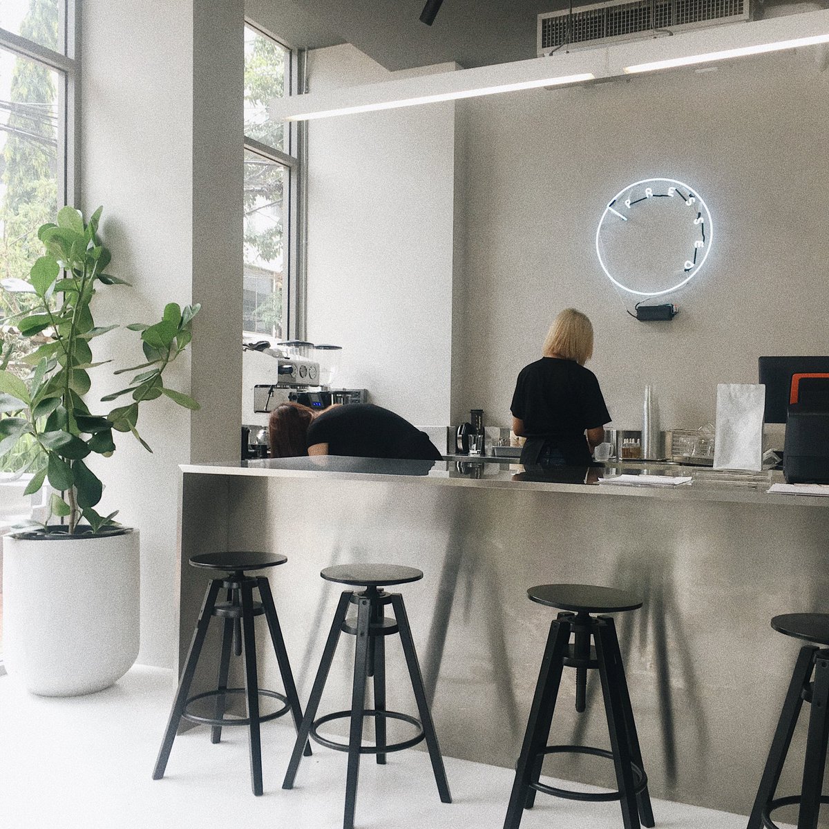 คาเฟ่ย่านพระราม9 ตกแต่งในสไตล์มินิมอล โทนดำเทา บรรยากาศฮิปๆ เหมาะแก่การมานั่งทำงานหรืออ่านหนังสือ มีปลั๊กและไวไฟ พร้อมจิบกาแฟไปด้วยเพลินๆ