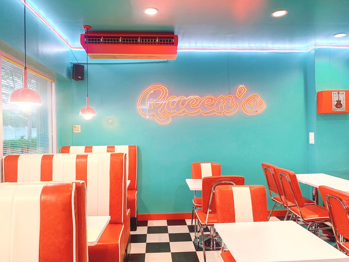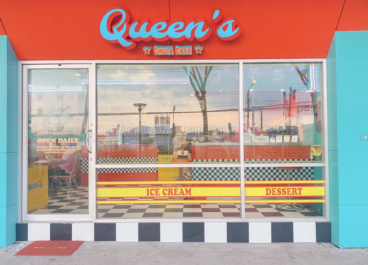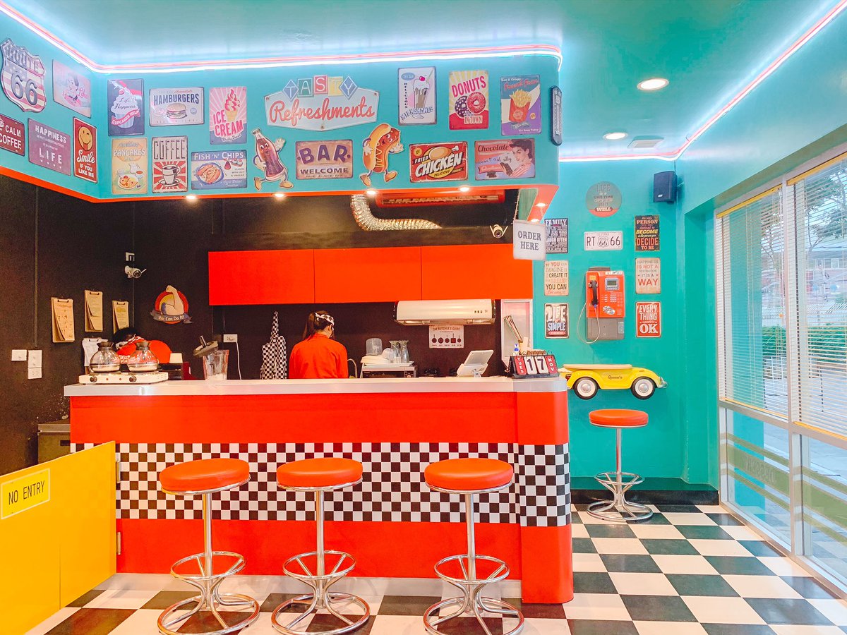 คาเฟ่สไตล์อเมริกันย่านจุฬา สีสันสดใส ฟีลย้อนยุค 50s ตกแต่งได้ลงตัว มุมถ่ายรูปแน่น เมนูมีทั้งเฟรนฟราย แพนเค้ก ข้าว เครื่องดื่มอย่างมิลค์เชค ราคาไม่แพง บริการเฉยๆ