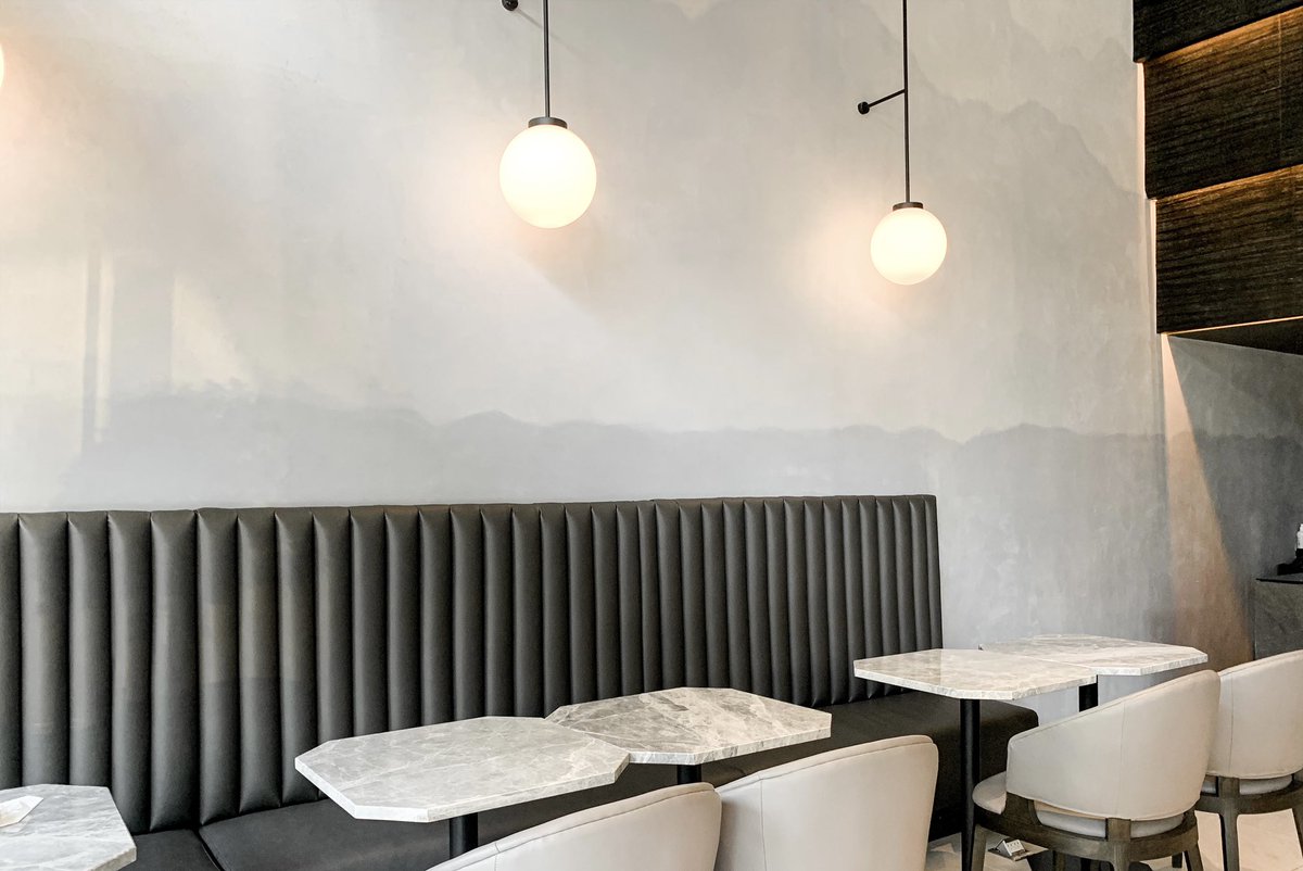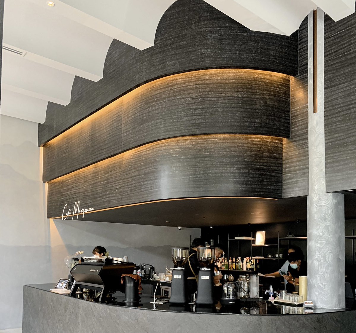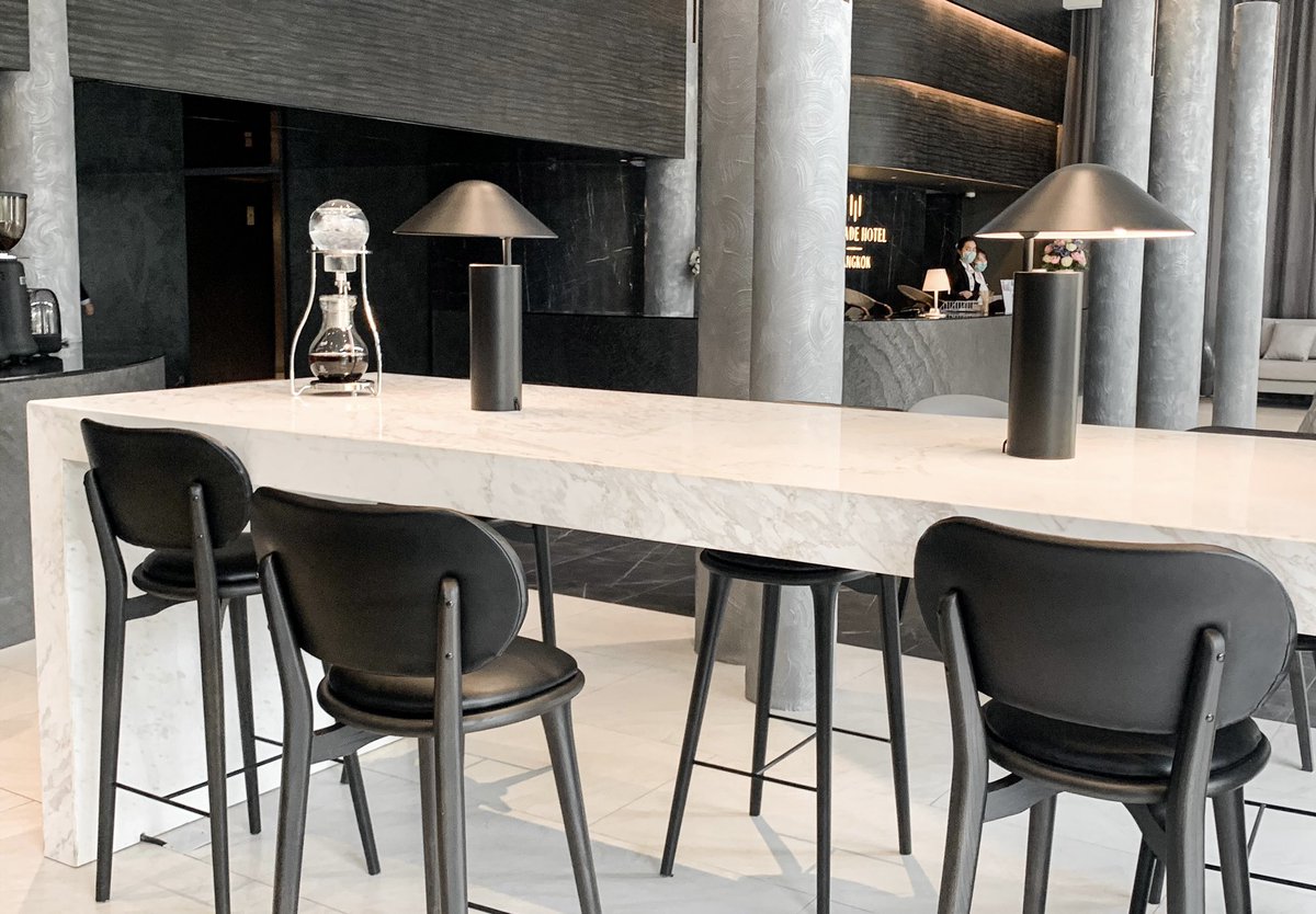 คาเฟ่สุดเท่ย่านกรุงธนบุรี คุมโทนดำ ดีไซน์เก๋ กับลาดลายหินอ่อน มีความโมเดิร์น อยู่ในโรงแรม Cascade hotel มีกาแฟและเครื่องดื่ม คนไม่พลุกพล่าน เหมาะแก่การมานั่งทำงาน