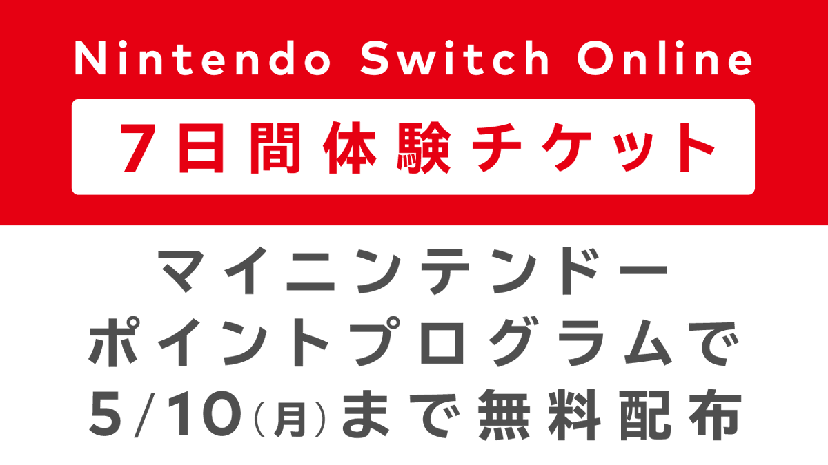 マイニンテンドーポイントプログラムで、「Nintendo Switch Online 7日間無料体験チケット」の配布を開始しました。 5月10日(月)までの期間限定で無料配布しています。 この機会に、「Nintendo Switch Online」及び、「#いっせいトライアル」をお楽しみください。