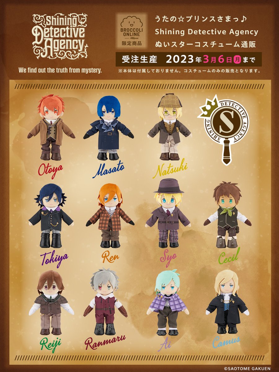 コラボ謎解きイベント「うたの☆プリンスさまっ♪ Shining Detective Agency」から、BOL限定で探偵たちの「ぬいスターコスチューム」11種が期間限定で受注生産受付中🎉