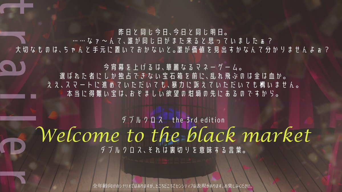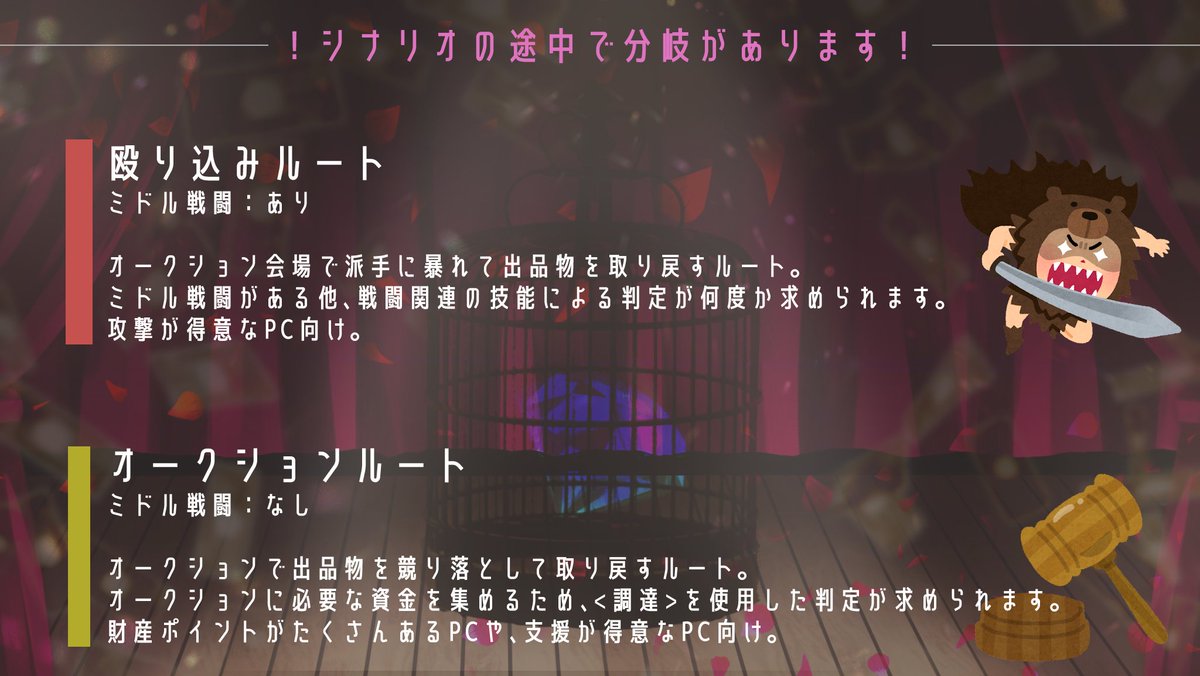 令和の世に闇オークションから相方PCを取り戻すシナリオ DX3「Welcome to the black market」 2PLでもいいし、GMが片方のPCを担当してもOK! 会場に乗り込んで殴り込みで奪うか、オークションで競り落とすかはあなた次第! あなたも闇オクに出品されよう! 11/22 #うちよそクロス にて公開予定です!