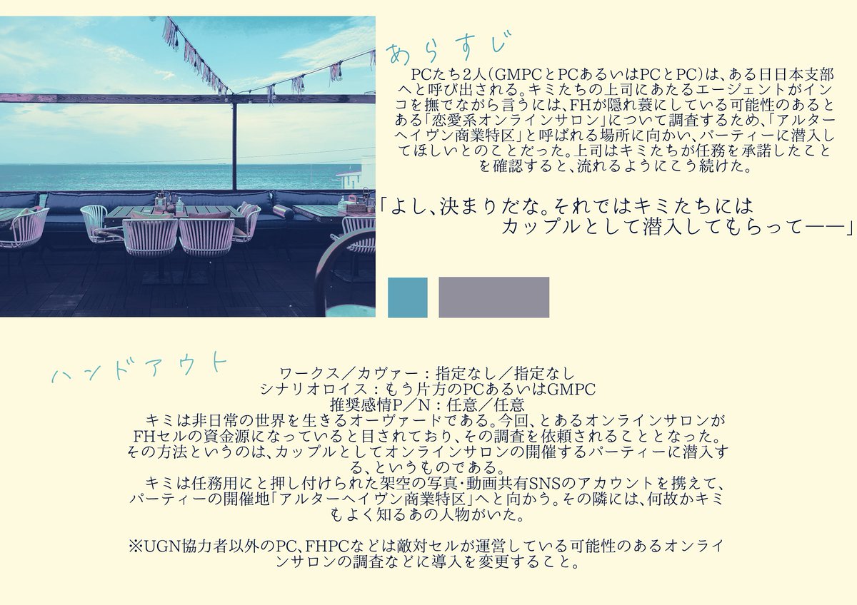 よし、決まりだな。それではキミたちにはカップルとして潜入してもらって―― DX3『ヴァソ・トラップ・フォーユー』 タイマンor2PLで「アルターヘイヴン商業特区」という都市にカップルを装って観光したり、パーティーに行ったりしてもらいます。 DL👇 kurumikurumiyeah.booth.pm/items/4335299 #うちよそクロス