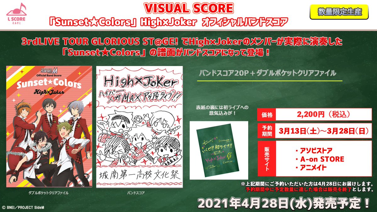 【今週末まで‼️】High×Joker「Sunset★Colors」オフィシャルバンドスコアの受注は今週末3/28(日)までとなります‼️ご注文まだのプロデューサーさんはお忘れなく🎸🎹🥁🎤 #SideM #えるすこ twitter.com/SideM_lantis/s…