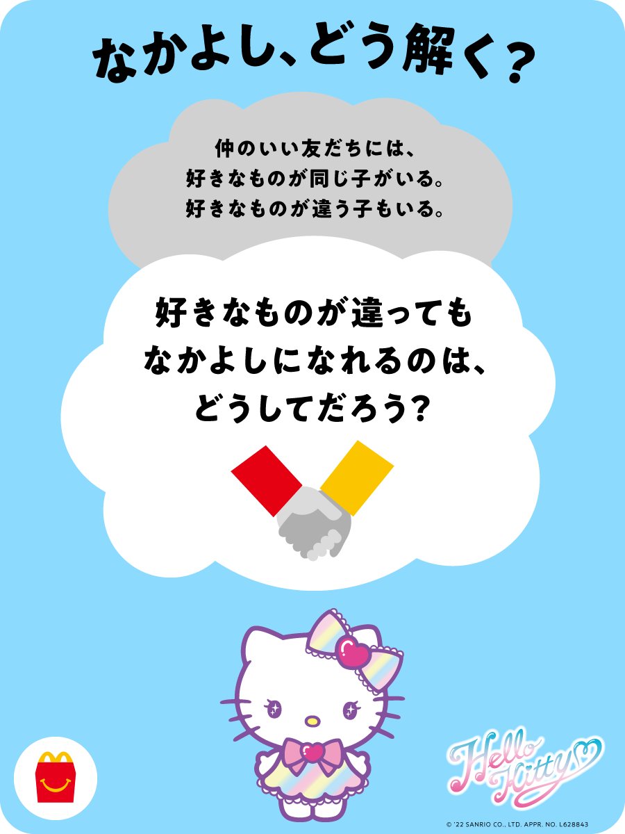 👧{おもちゃで!どう解く?}👨 ハローキティにちなんだ問いはこちら! キティちゃんには、タイニーチャムやモーリーなど、 なかよしな子がたくさんいるよね。 皆さんは、どう解く? ハッピーセット®︎のおもちゃと一緒に親子で考えて、 コメント欄で教えてください✨ #おもちゃでどう解く