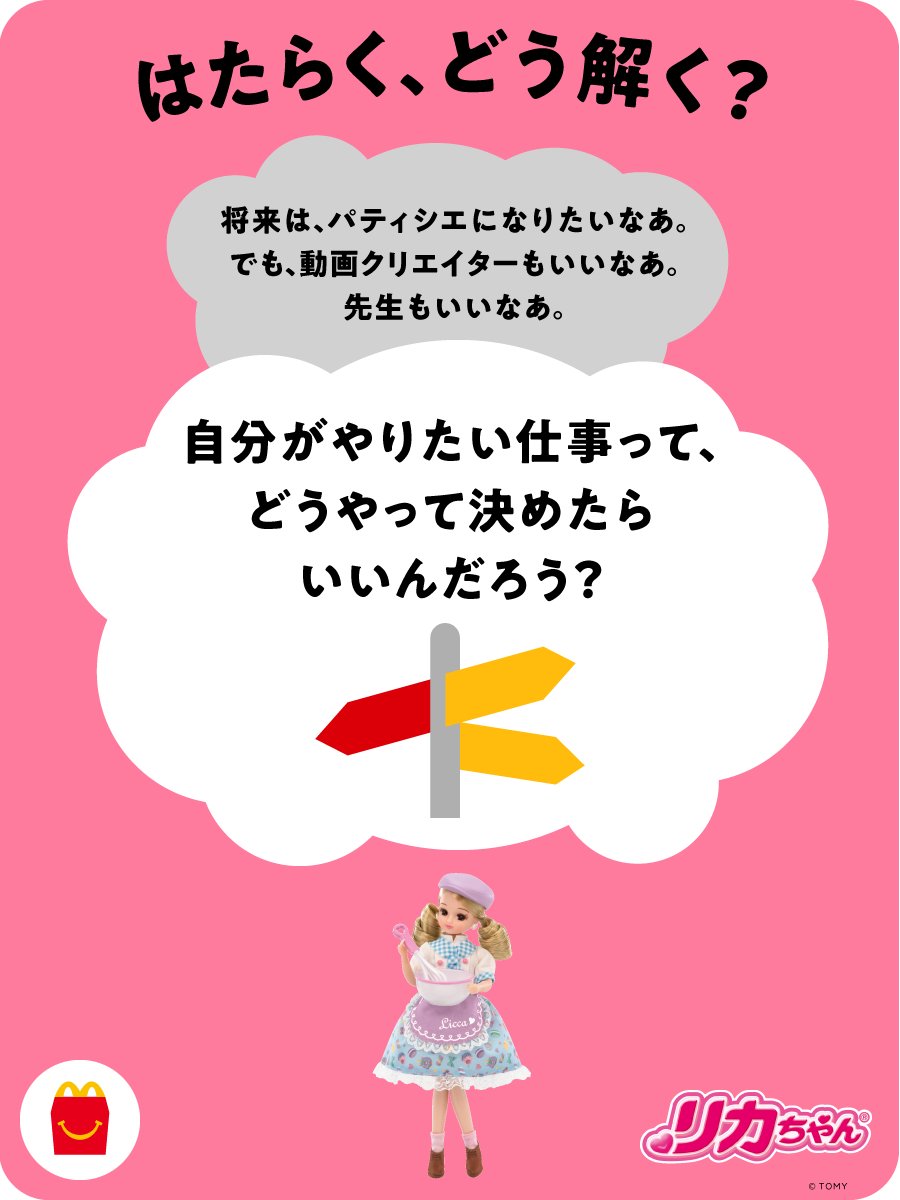 👧{おもちゃで!どう解く?}👨 リカちゃんにちなんだ問いはこちら! リカちゃんはお医者さんやパティシエなど、 いろんなお仕事に挑戦しているよね。 皆さんは「はたらく、どう解く?」 ハッピーセット®︎のおもちゃと一緒に親子で考えて、 コメント欄で教えてください✨ #おもちゃでどう解く