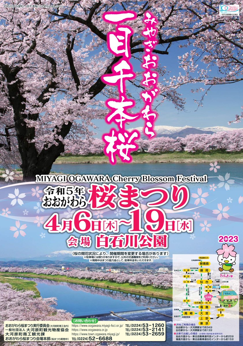 宮城県大河原町では、4年ぶりに「おおがわら桜まつり」を開催するよ!お祭り期間は、令和5年4月6日(木)〜19日(水)まで!会場は白石川公園でJR東北本線 大河原駅より歩いて3分の所にあるよ♪みんなぜひお花見に来てね~🌸