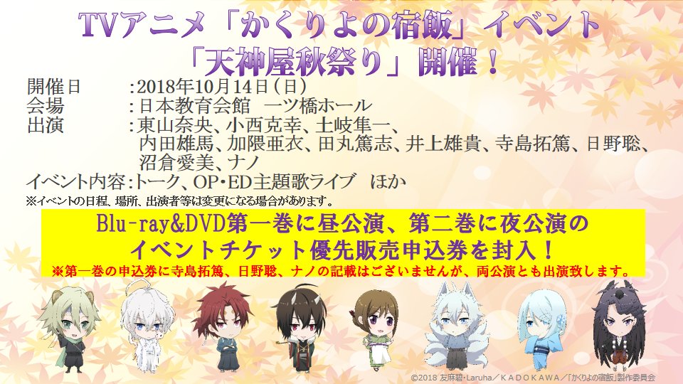 【天神屋秋祭り】10月14日(日)一ツ橋ホールにて、TVアニメ『かくりよの宿飯』イベント「天神屋秋祭り」が開催!本日発売のBlu-ray&DVD第一巻には、昼公演のチケット優先販売申込券が封入されています。お申込締切は、7月29日(日)23時59分までですので、お忘れなきよう!#かくりよの宿飯