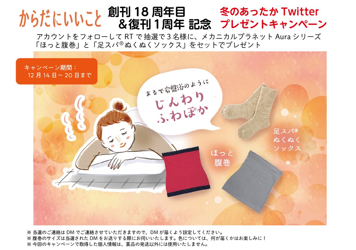 #からだにいいこと 創刊18周年目&復刊1周年 記念 #プレゼント #キャンペーン ✨ ① @karakoto_mag をフォロー ② ツイートをRT で抽選で3名様に「ほっと腹巻」と「足スパ(R)ぬくぬくソックス」をセットで🎁 〆切→12/20 23:59 #懸賞 #プレゼント企画 #からオーラコラボ #プレゼントキャンペーン
