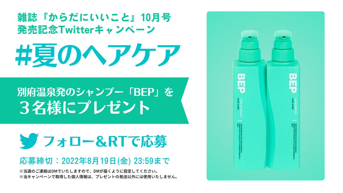 #からだにいいこと 10月号発売記念✨強い紫外線にも負けない #夏のヘアケアキャンペーン 開始👩‍🦰 ✅@karakoto_mag をフォローして ✅このツイートをRTで 別府温泉発「#BEP」を3名様に #プレゼント 🎁 〆切→8月19日23:59 #夏のヘアケア #SNS懸賞 #プレゼントキャンペーン