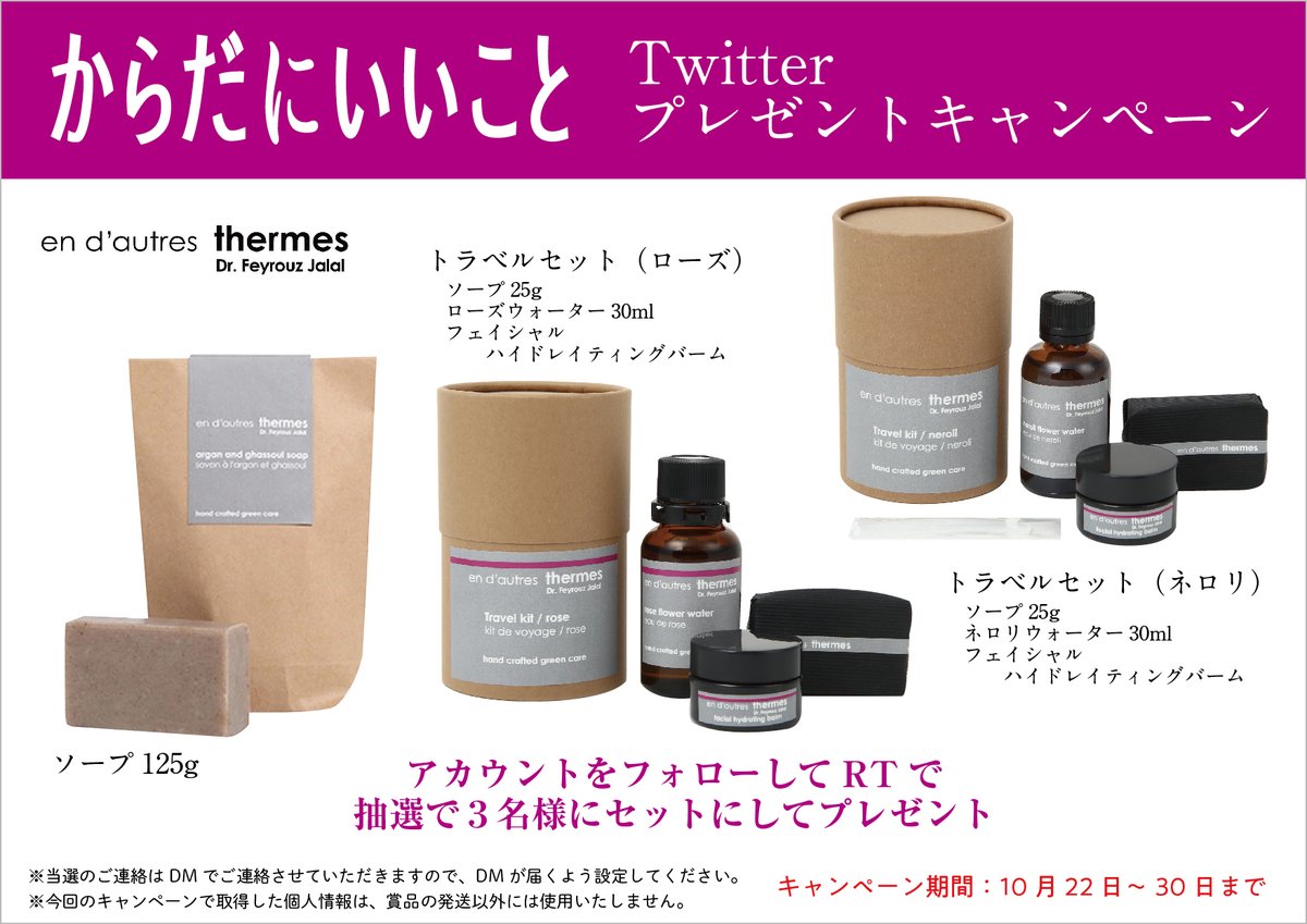 #からだにいいこと #プレゼントキャンペーン 🎁 ✅@karakoto_mag をフォロー ✅ツイートをRT で「アン・ドートル・テルム」の乾燥地帯モロッコの気候が育んだ植物由来の天然ソープを含む人気商品(総額11,000円相当)3つをセットで抽選で3名様に #プレゼント ⚠️〆切→10/30 23:59 #SNS懸賞 #懸賞