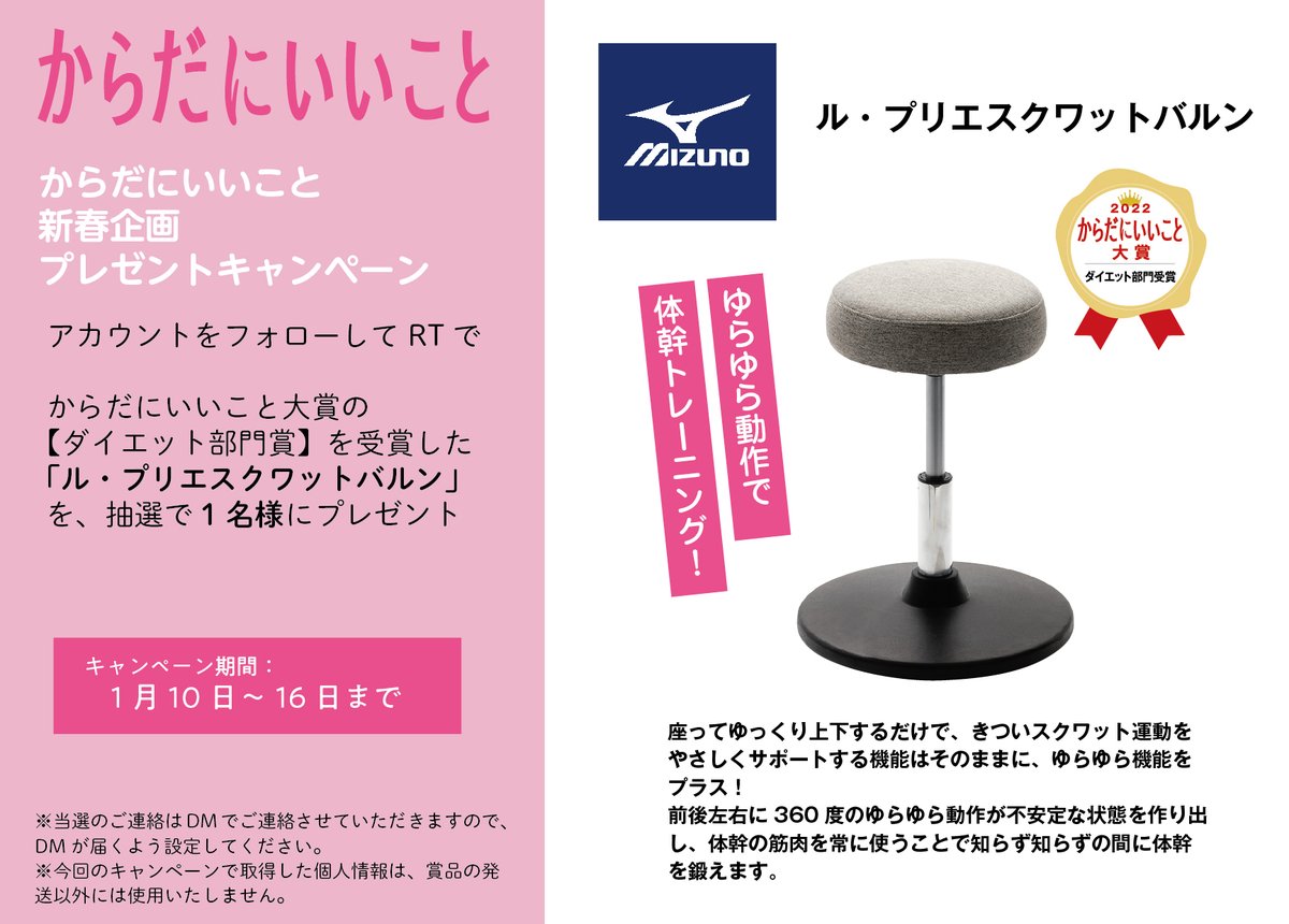 #からだにいいこと 新春🌅企画 #プレゼントキャンペーン 🎁 1⃣ @karakoto_mag をフォロー 2⃣ このツイートをRT …で、#からだにいいこと大賞 ダイエット部門を受賞した #ミズノ「ル・プリエスクワットバルン」🪑を抽選で1名様に #プレゼント ♥️ 〆切→1/16 23:59 #SNS #SNS懸賞