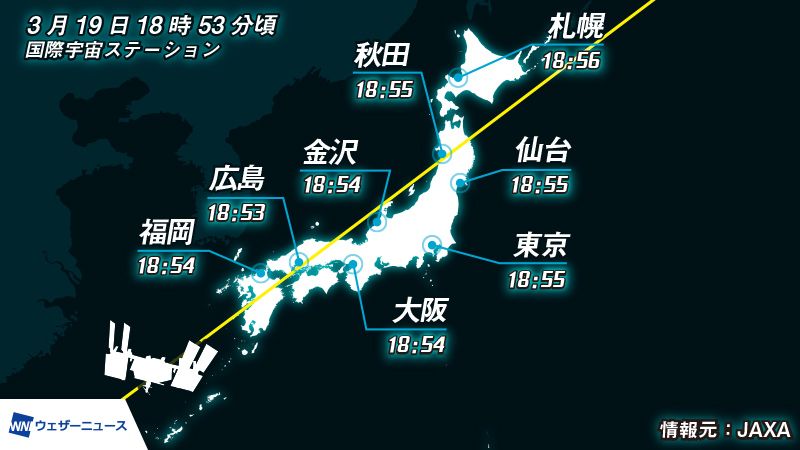 JAXAによると、宇宙飛行士の野口聡一さんが滞在する国際宇宙ステーション(ISS)/きぼうが、昨日に続いて今日3月19日(金)も19時前に日本付近を通過します。遮る雲が無ければ、全国的に国際宇宙ステーション(ISS)/きぼうを見るチャンスです。