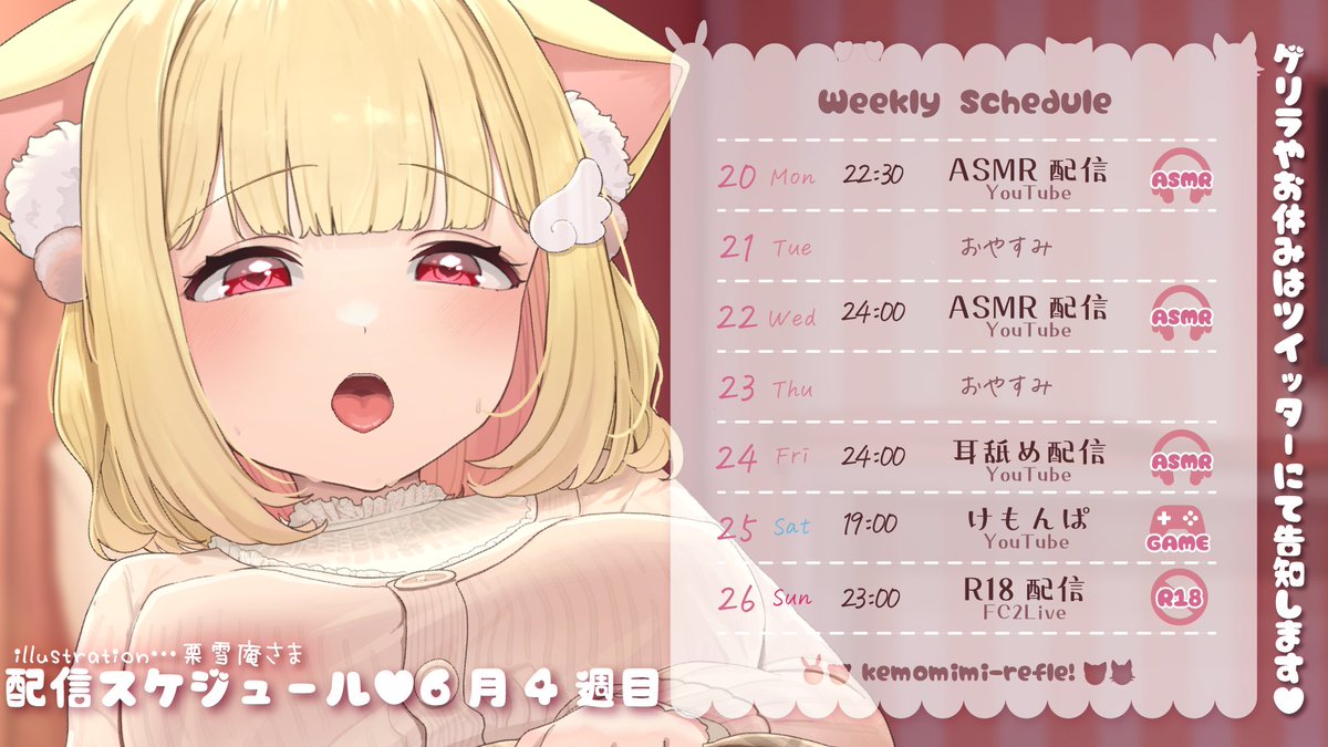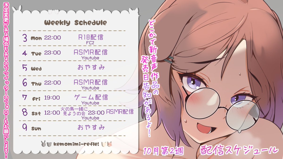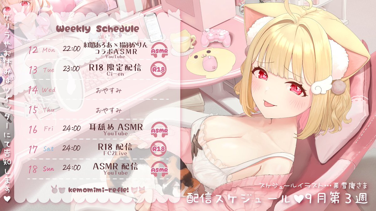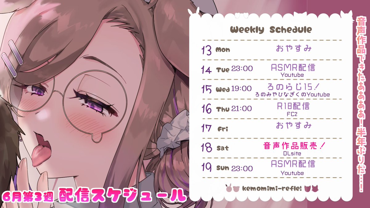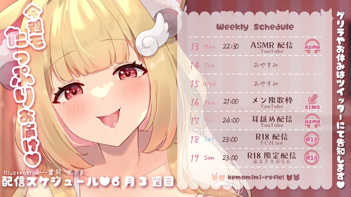 今週もASMRにゲーム実況、アダルト配信、歌ってみた投稿、各所限定配信等と盛りだくさんです✨