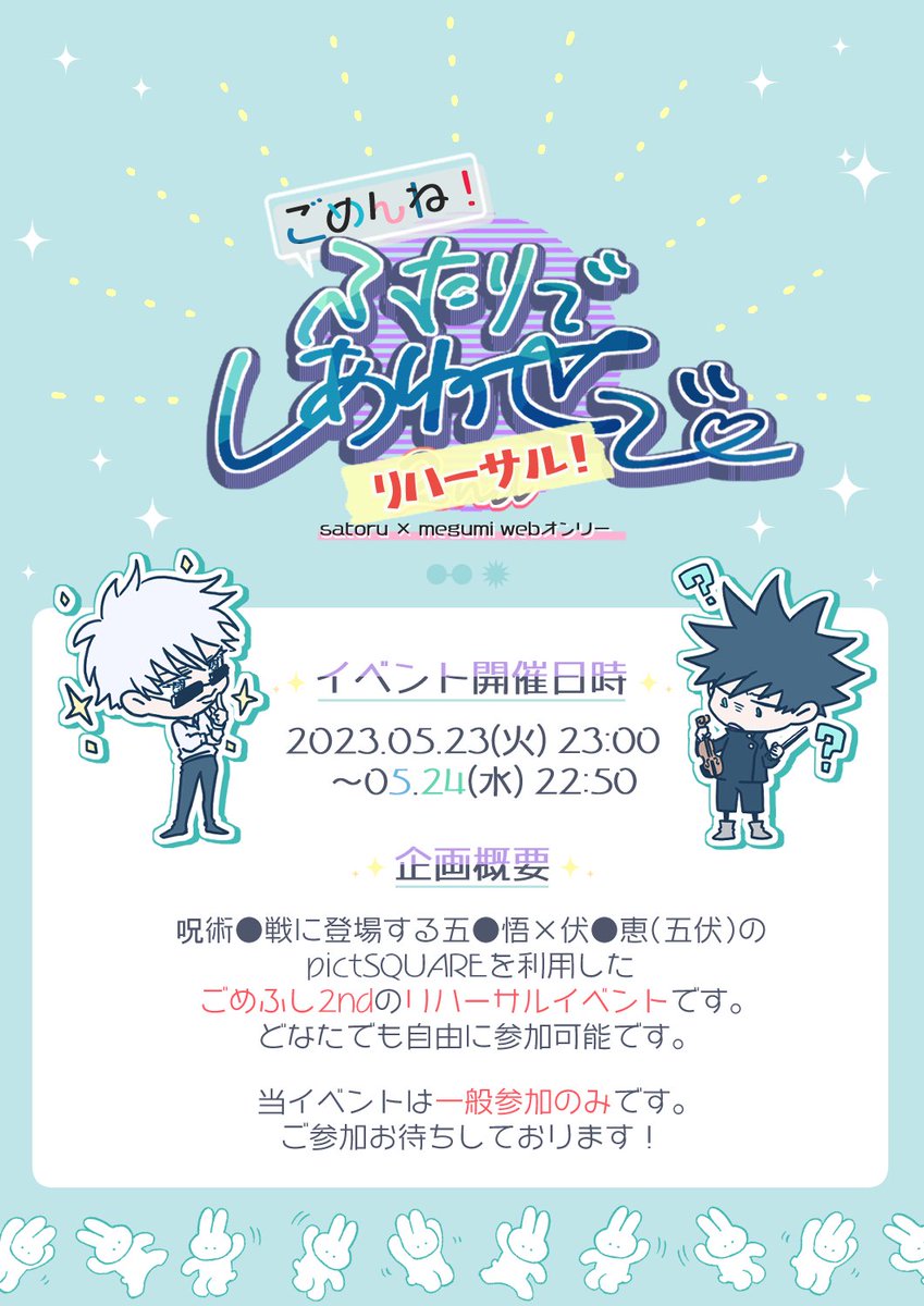 【🥸📝五伏webリハーサルイベント開催します📝🥸】 2023年5月24日(火)にpictSQUARE内にて五伏webオンリーのリハーサルイベントを開催いたします! こちらは一般参加のみでサークル募集はございません 詳しくはURL先をご確認ください #ごめふし2ndRH pictsquare.net/4tcw0sqvgjztiq…