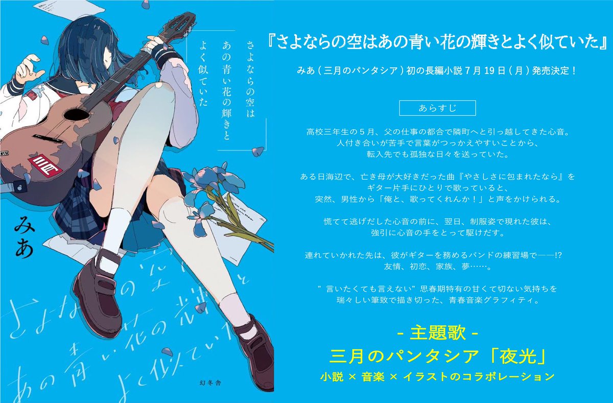 【みあ初の長編小説・出版決定!】 タイトル「さよならの空はあの青い花の輝きとよく似ていた」 みあ初の長編小説を幻冬舎から7月19日(月)に発売します📖🔵『小説×音楽×イラスト』をかけ合わせた“青春グラフィティ” #さよ花 ▼詳細▼ amazon.co.jp/dp/4344038258/…