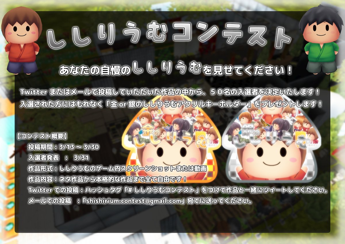 TEAM_M主催でししりうむコンテストをやります。本日から3/30まで応募可能です。入賞者50名に特製アクキーが当たります。どしどし応募してください。