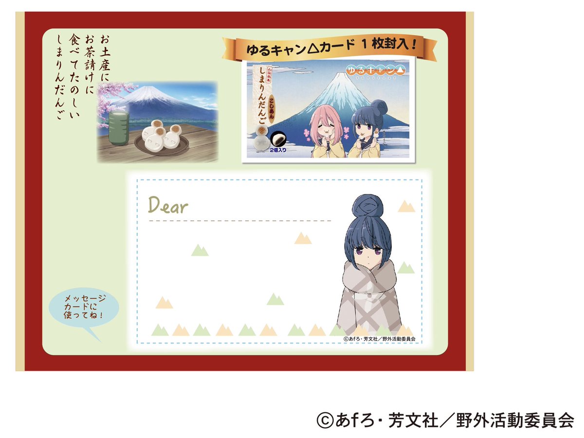 #ゆるキャンΔ 新商品 #しまりんだんご こしあん リニューアルした しまりんだんご 粒あん・巨峰あん・柚子あんに続く第4弾は こしあんになります パッケージデザインの しまりんだんごカード付き
