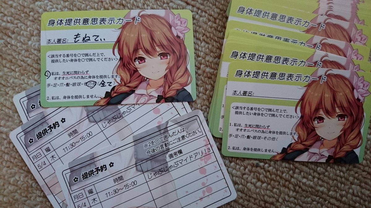 会場で新刊購入特典としてオオオニバス専用ドナーカードを配布しますよー。 #フラワーナイトガール #じゃぶマイ