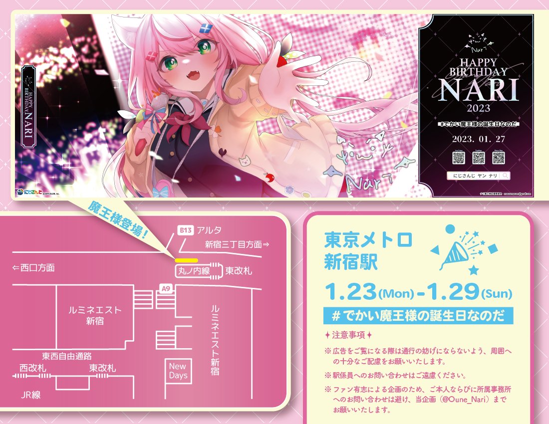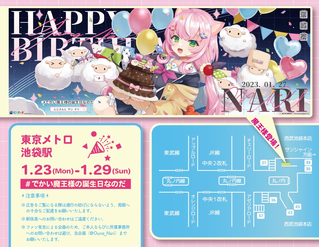 📌応援広告掲出のお知らせ📌 ナリ魔王様のお誕生日を祝して、本日より駅広告を掲出しております🎉 【場所】東京メトロ新宿駅&池袋駅 【期間】1/23(月)~1/29(日) 詳細は画像をご確認下さい🐑 ※駅係員へのお問い合わせはご遠慮ください。 #でかい魔王様の誕生日なのだ
