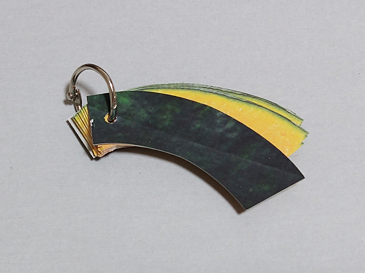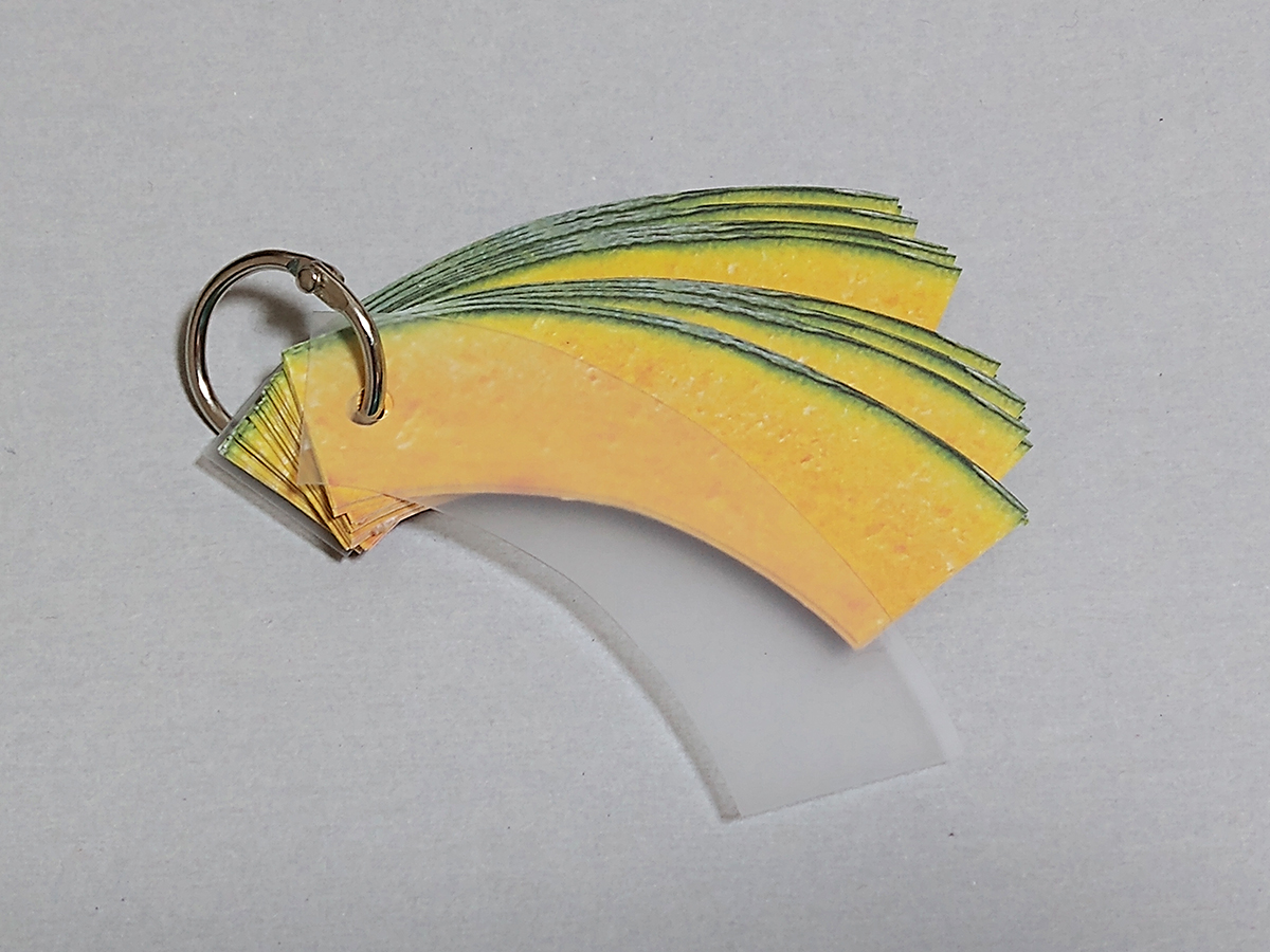 「紙博」含め、3月後半以降の新作準備を開始。 スライスかぼちゃの一言カードをリニューアルして「単語帳」風にしてみました。 表紙を中のカードと同じ柄にするか、かぼちゃの皮にするか、印刷なしのPPにするか、迷い中。 穴部分に紐を通して栞としてなど、色々使えるかと。 #なぜ作った