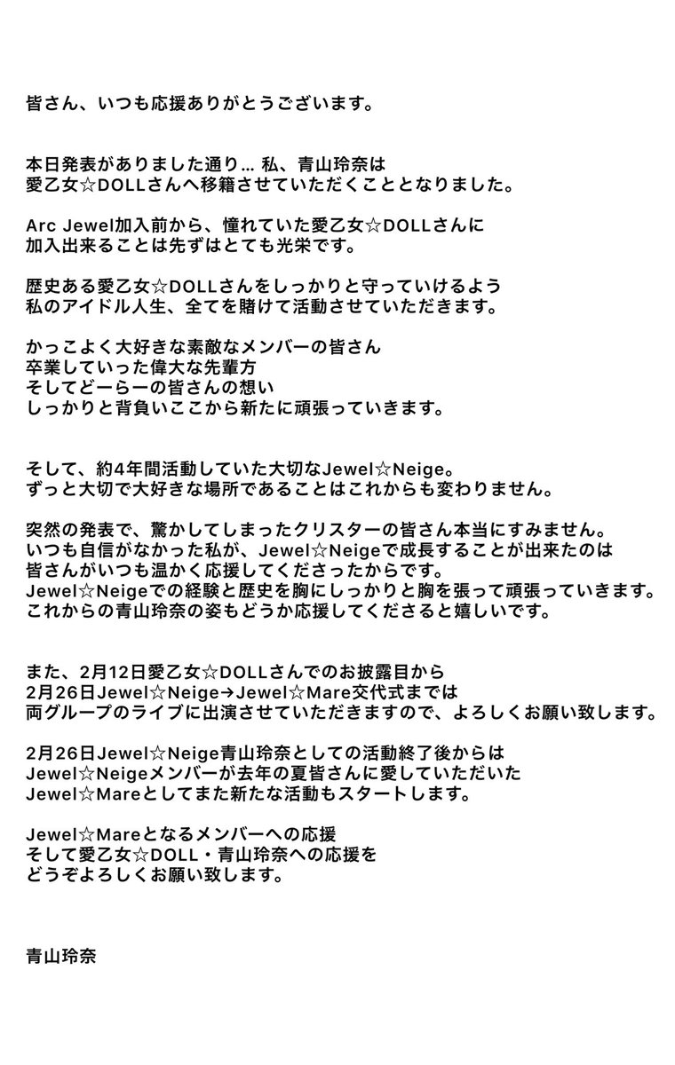 【お知らせ】 私、Jewel☆Neige青山玲奈は2022年2月26日をもって愛乙女☆DOLLさんへ移籍させていただきます。 自分のアイドル人生全てを賭けて頑張らせていただきます!!何卒、応援よろしくお願い致します。 #ねーじゅ #らぶどる twitter.com/Jewel_Neige/st…