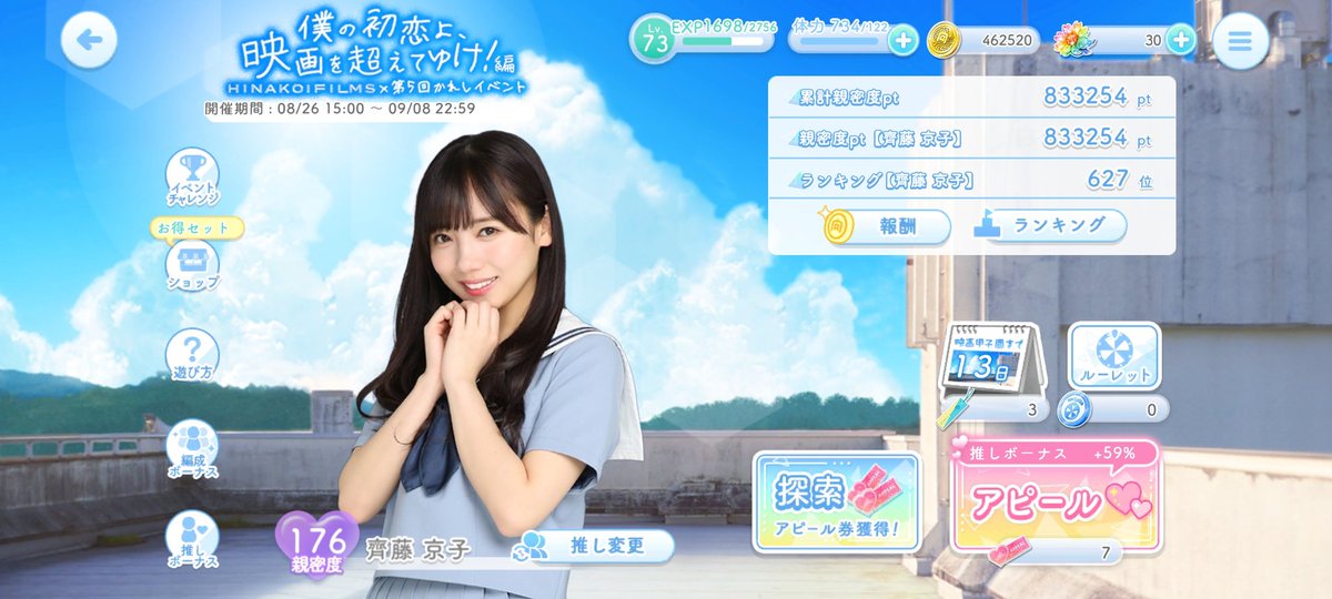 3日目突入!今日で120Pt 「いいね」「RT」で獲得できる『ひなこいサマーPt』の上限は、毎日0:00にリセット!