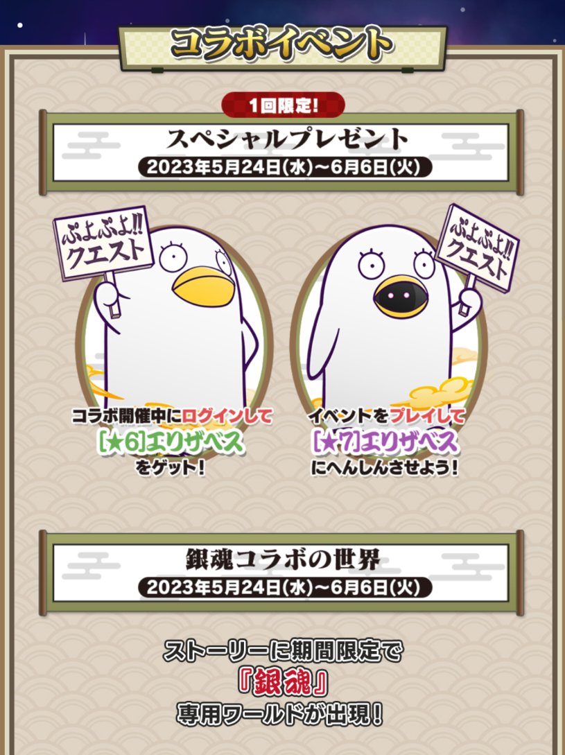 『ぷよぷよ!!クエスト』と『銀魂』コラボ、5月24日(火)から開催決定!坂田銀時や志村新八、神楽をはじめ、銀魂に登場するキャラクターがぷよクエの世界で大活躍!特設サイトではキャラクター情報をはじめイベント情報やキャンペーン情報など公開中! puyopuyoquest.sega-net.com/collabo/puyo_g… #ぷよクエ #銀魂