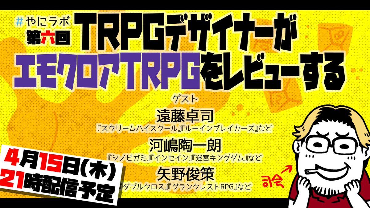話題の #エモクロアTRPG をプロのゲームデザイナーはどう見たか。 「TRPGデザイナーがエモクロアTRPGをレビューする」 ゲストに遠藤卓司 @takujiendo 河嶋陶一朗 @higetoboin 矢野俊策 @Syano_open の豪華メンバーを迎えて、4/15(木)配信予定です! youtube.com/channel/UCu_va… #やにラボ