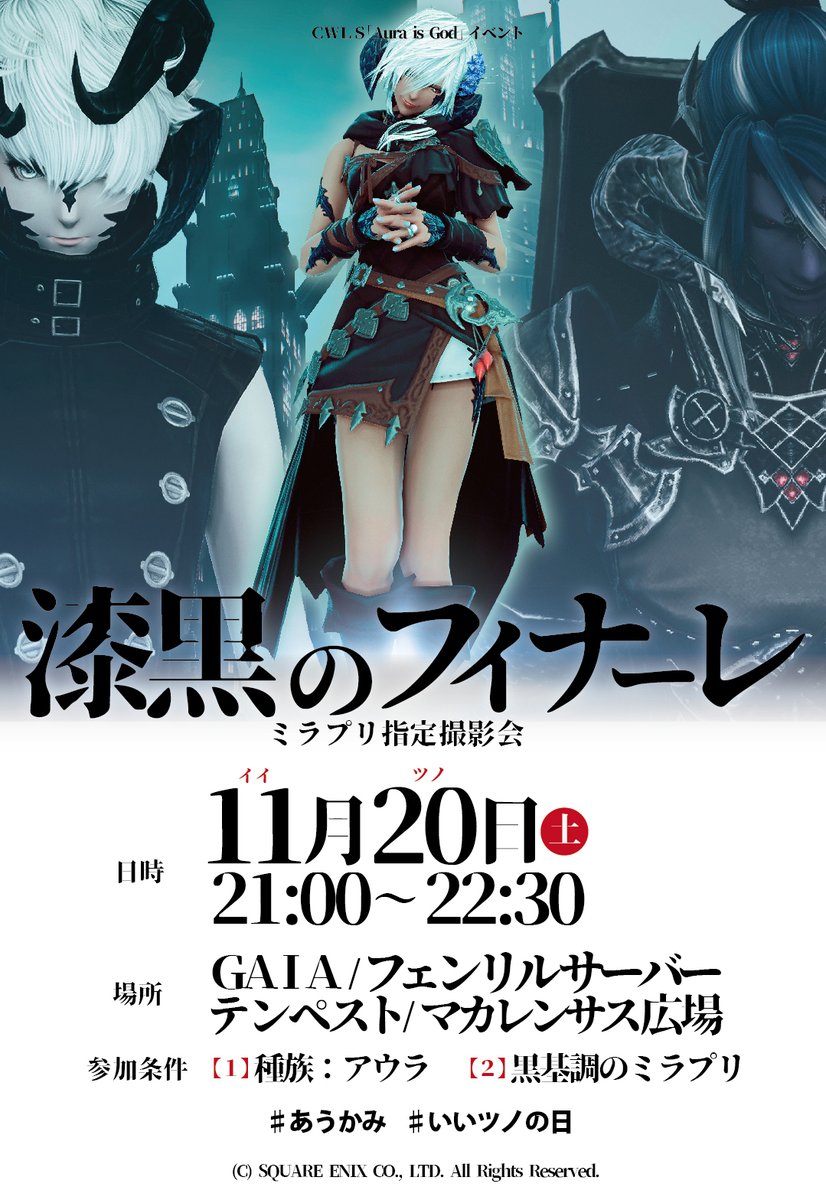 あうかみ、漆黒最後のイベント 「漆黒のフィナーレ」 アーモロートにて開催します。 11月20日(土) 21:00~22:30 ガイア/フェンリル テンペスト/マカレンサス広場 集合 ※アウラであれば、どなたでも参加できます。 ※黒基調のミラプリでお越しください。