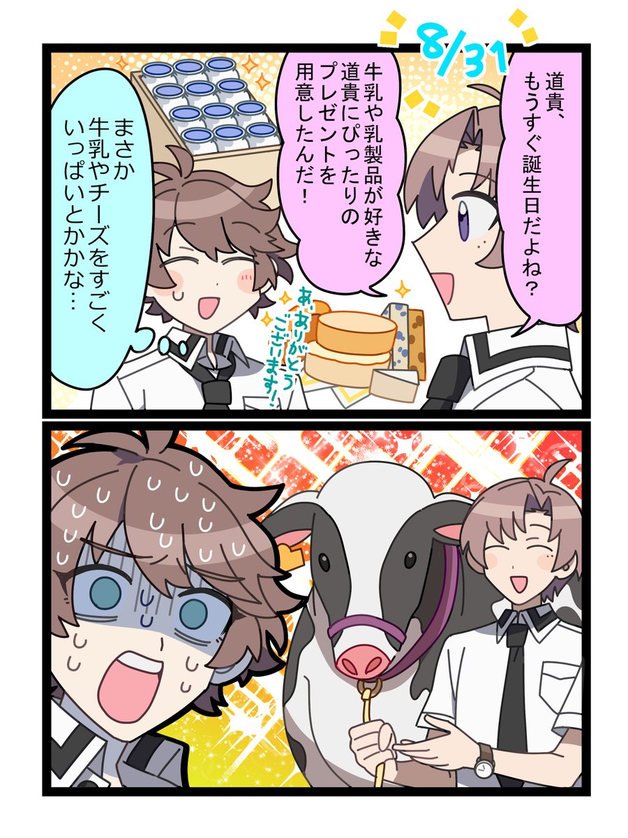 2コマ漫画で生徒たちを紹介する「わちゃぺら-ボクらのアオペラ活動-」本日の活動日誌は「道貴の誕生日プレゼント」です🎁