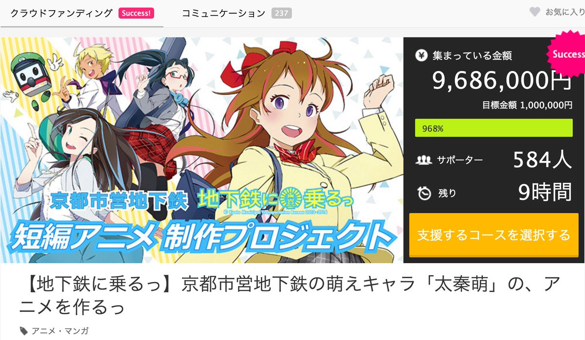 【1000万円突破】京都市営地下鉄「地下鉄に乗るっ」クラウドファンディング、ついに終了致しました。最終金額は10,322,000円でした。ご支援くださった皆様、本当にありがとうございました! #アニメを作るっ