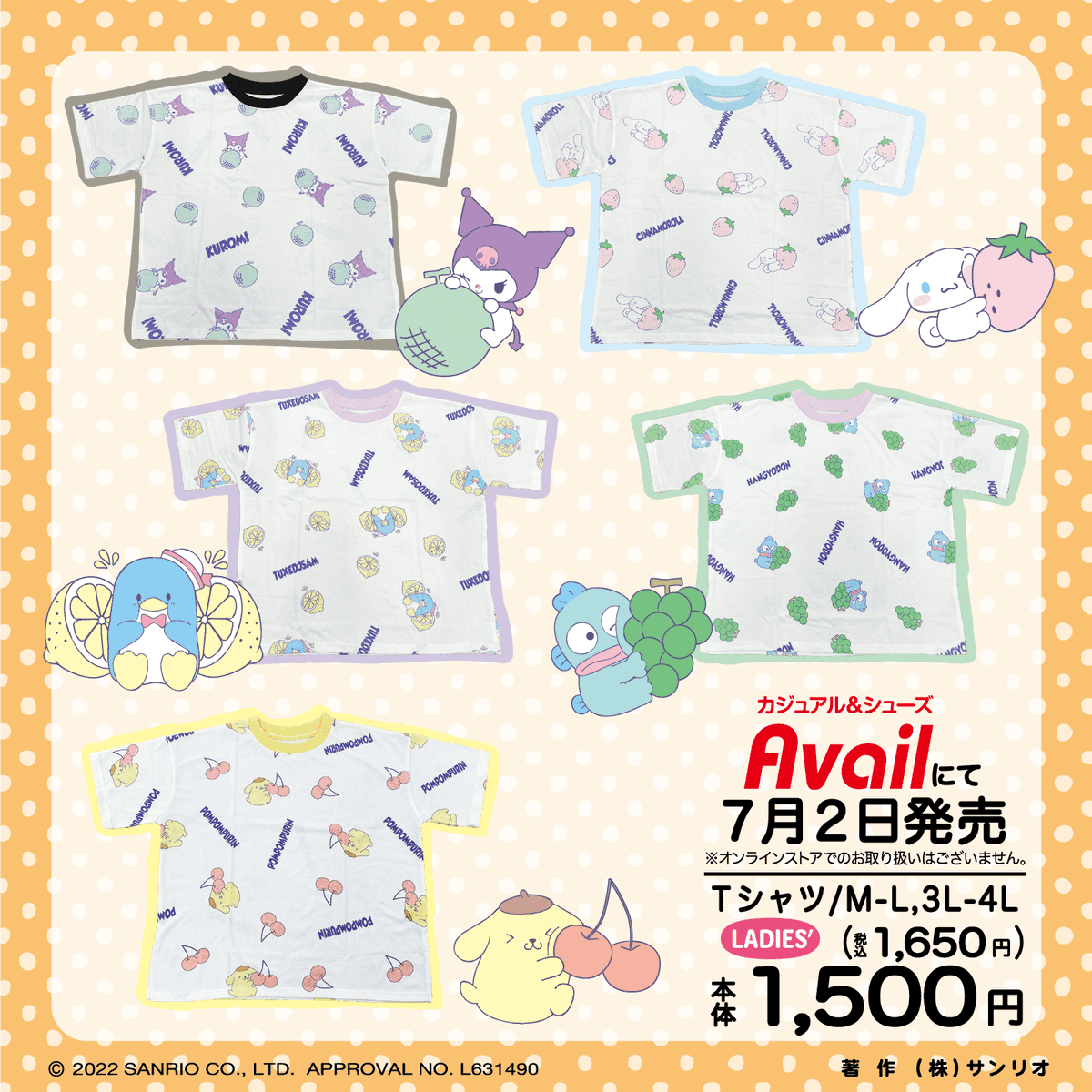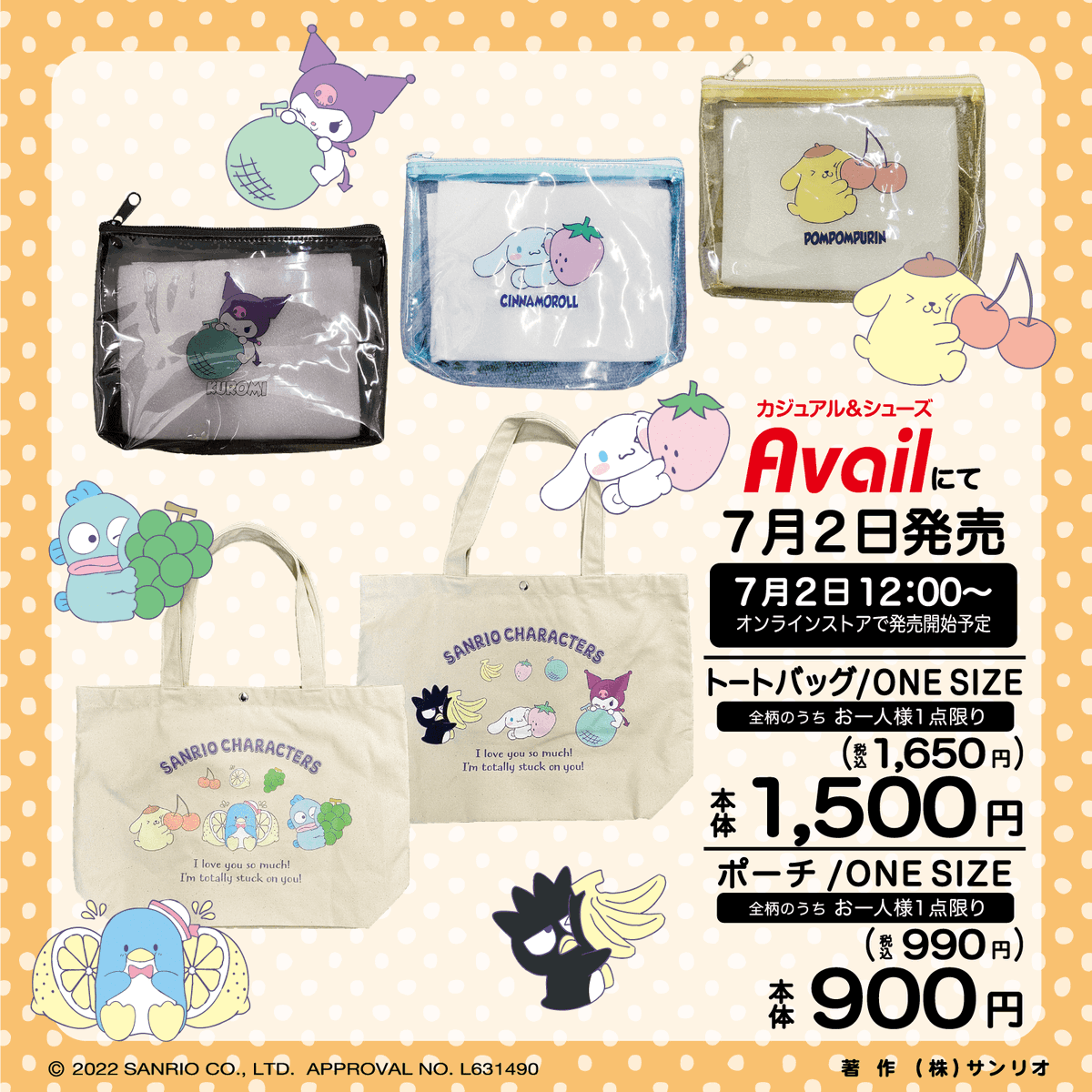 7/2(土)~全国の #アベイル にカラフルなフルーツシリーズが登場♪トートバッグ・ポーチのみオンラインストアで同日12:00~販売→ sanrio.eng.mg/1c98c #avail 店舗→ sanrio.eng.mg/b0a7d ※点数制限は画像をご確認ください。