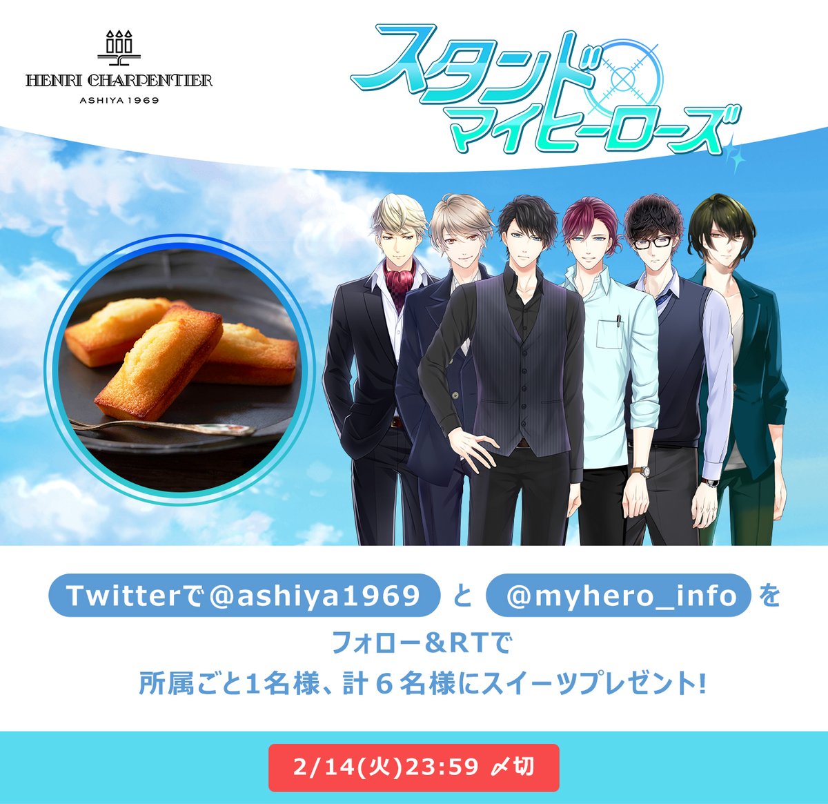#スタマイ コラボキャンペーン! 抽選で6名様に #アンリシャルパンティエ のスイーツをプレゼント🎁 \ 詳しくは👉onl.tw/tmcme9g ▼応募方法 ①@ashiya1969+@myhero_infoをフォロー ②ご希望の所属名(例 #マトリ)を記載の上、引用リツイートで投稿! 2/14(火)23:59 〆切