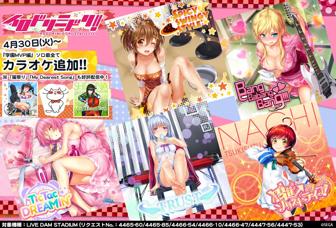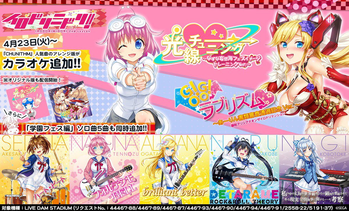 4/23(火)より全国のLIVE DAM STADIUMにて『光線チューニング ~なずな妄想海フェスイメージトレーニングVer.~』『GO!GO!ラブリズム♥ ~あーりん書類審査通過記念Ver.~』さらに『学園フェス編』からソロ楽曲5曲が配信追加です!歌ってね!!