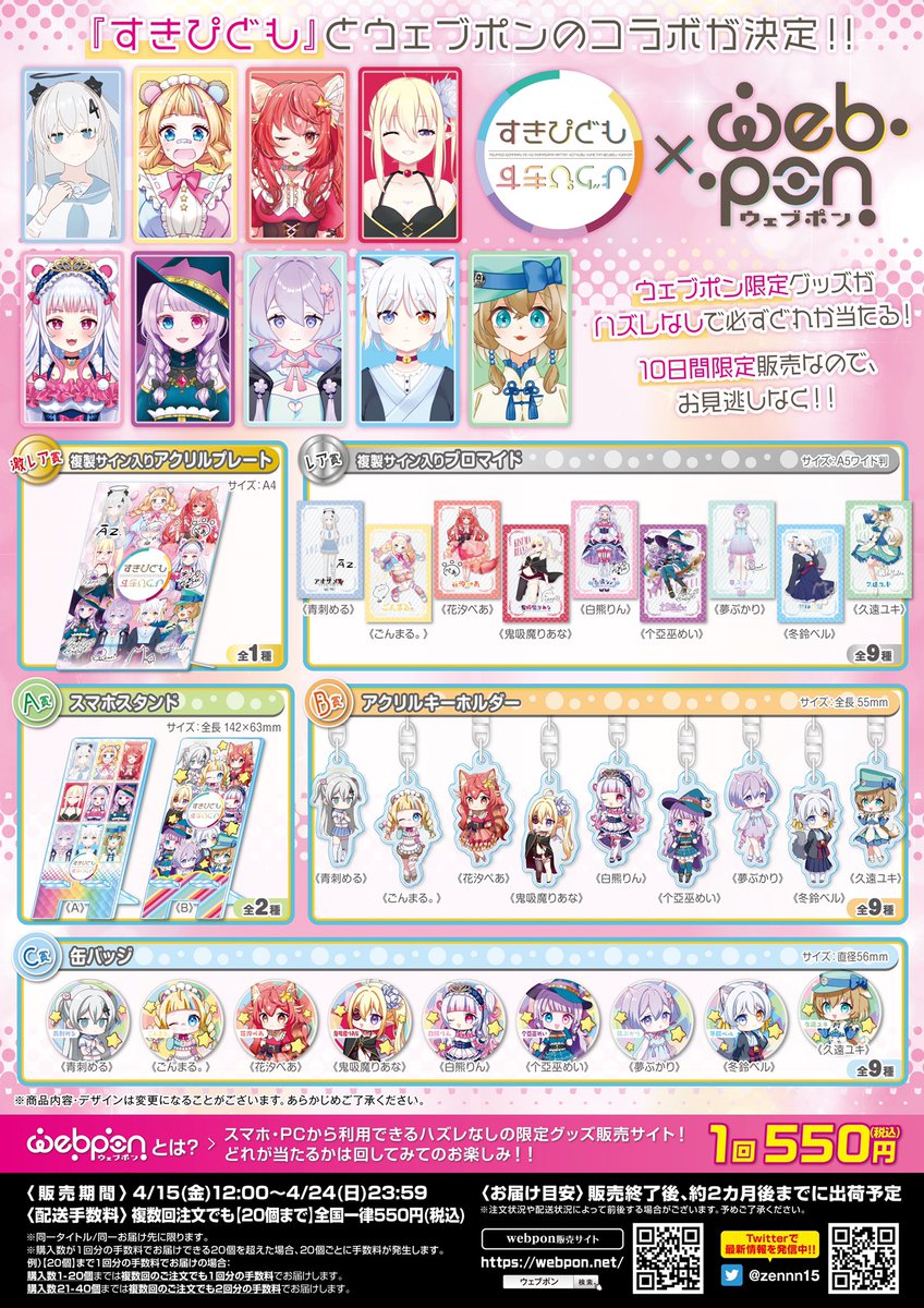 『すきぴども×ウェブポン』が4/15(金)12:00〜発売決定!!ウェブポン限定グッズがハズレなしで必ずどれか当たる!10日間限定販売!複製サイン入りアクリルプレートが当たるキャンペーン実施中!詳細→webpon.net/shop/SKP/plan/… #すきぴども #ウェブポン #すきぴどもウェブポン @ao_za4 @kisumariana