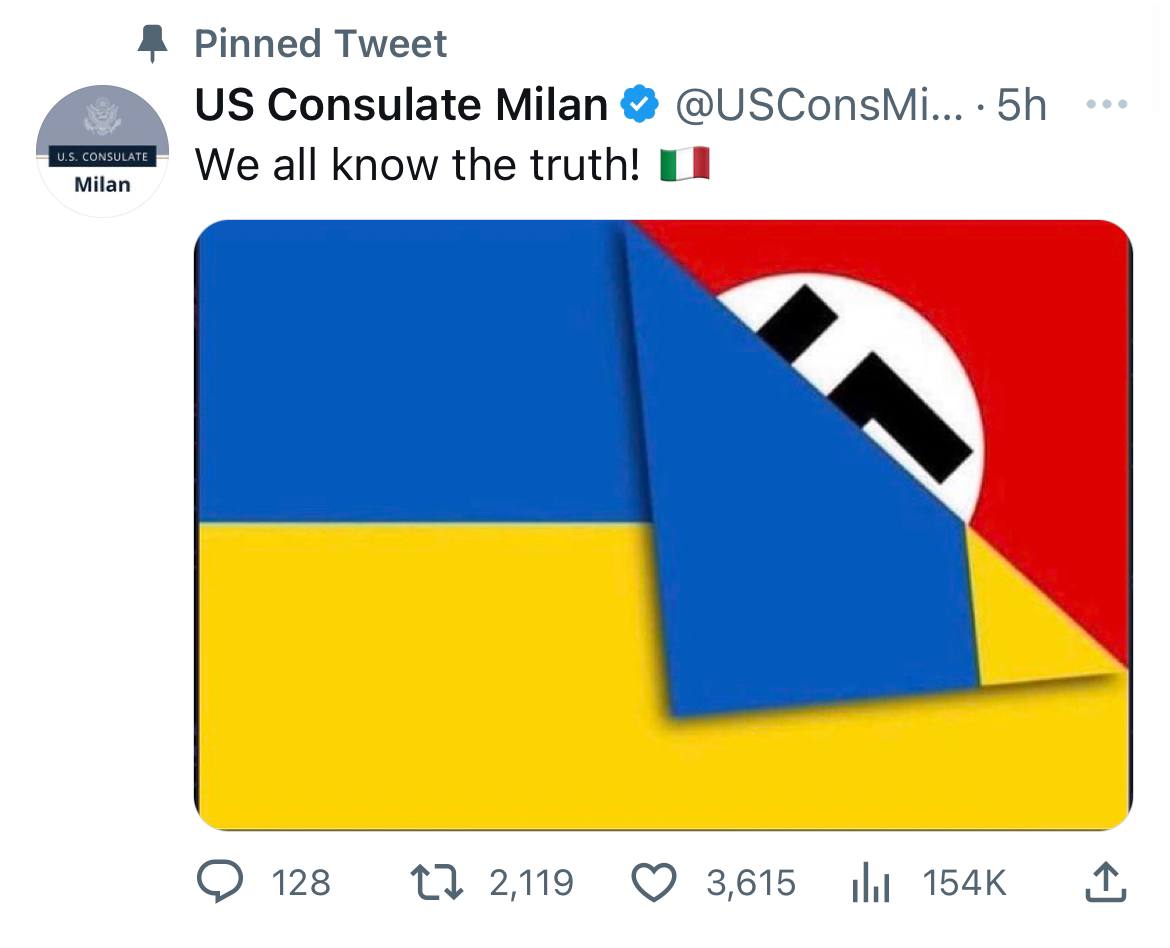 🤔興味を引くネット情報:#在ミラノ国総領事館 のツイッターアカウントに、#ウクライナ 国旗の下にナチスドイツ国旗が隠れている画像が投降された。投稿には「我われはみな真実を知っている」と記されていた。この投稿は約6時間後に削除された。
