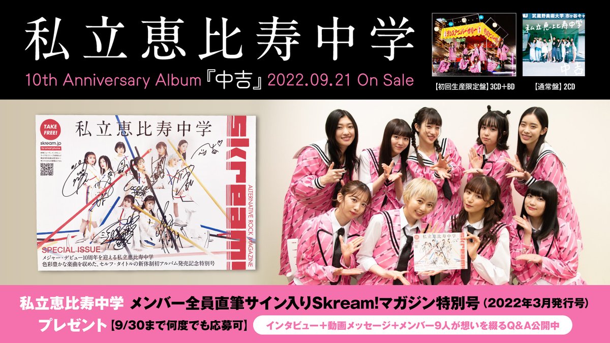 私立恵比寿中学メンバー全員直筆サイン入りSkream!マガジン特別号(2022年3月発行号)プレゼント。メジャー・デビュー10周年を記念したアニバーサリー・アルバム『中吉』に迫るインタビュー&動画メッセージ公開中