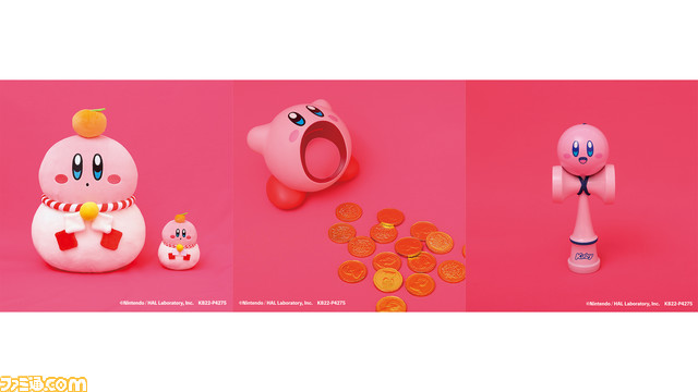 お餅に扮したカービィの大きなクッションや手のひらサイズのマスコット、口を大きく開けたカービィの貯金箱、玉がカービィになったけん玉などかわいいグッズが登場