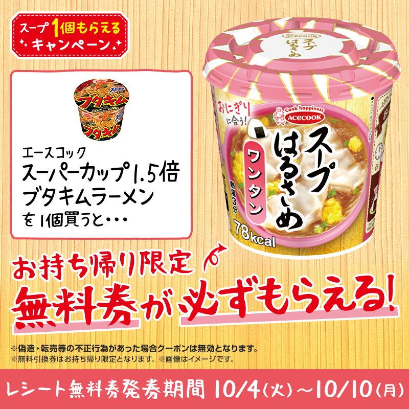 対象の「スーパーカップ1.5倍 ブタキムラーメン」を買うと、「スープはるさめ ワンタン」の(お持ち帰り限定)無料券がレシートについてきます(^^)10/10まで