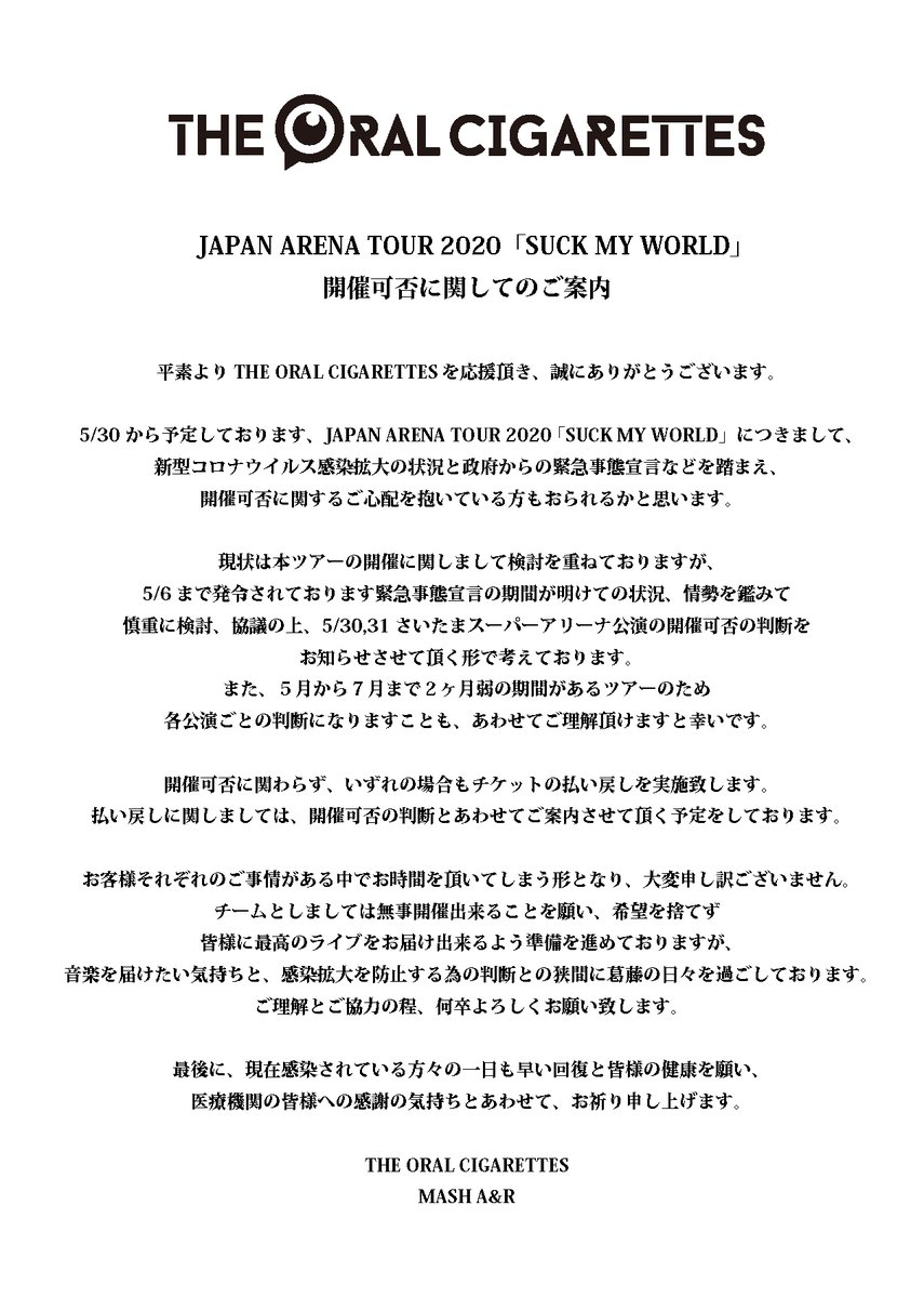明日10:00〜各プレイガイドにてJAPAN ARENA TOUR 2020「SUCK MY WORLD」が一般発売開始となります。