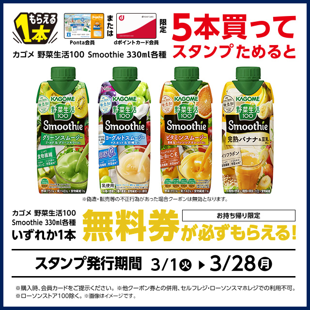 【ポイント会員限定】3/28まで、対象の「野菜生活100 Smoothie 330ml 各種」を5本買うと「野菜生活100 Smoothie330ml」の(お持ち帰り限定)無料券クーポンプレゼント(^^)