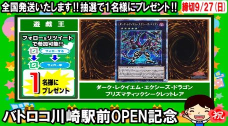 【リツイートキャンペーン】#遊戯王 バトロコ川崎駅前OPEN記念✨ ダークレクイエムエクシーズドラゴン プリシク を抽選で1名様にプレゼント🎁 1⃣このアカウントをフォロー 2⃣このツイートをリツイート 【締切】9/27 【発表】9/28(予定) ドンドンいきます!フォローお願いします! #カワロコ