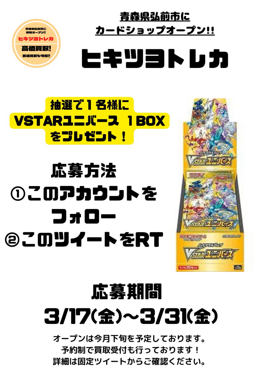 2回目のプレゼント企画を行います! 応募方法 ①このアカウントをフォロー ②このツイートをRT 締切は3/31(金) 当選者には4/1(土)にDMでご連絡させていただきます。 オープンまでは、予約制で買取も行っております。 興味のある方は固定ツイートをご確認ください。 #ポケモンカード #カードショップ
