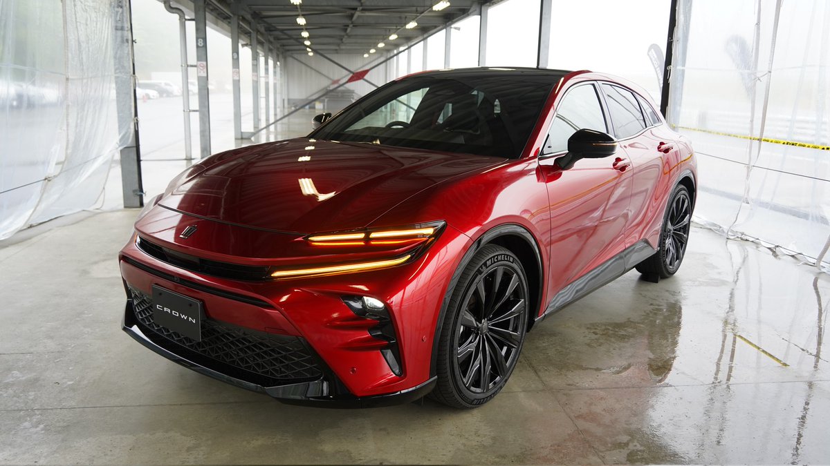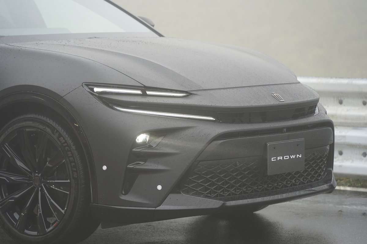 メインヘッドライトは日産ジュークとか三菱系にある、フォグとかほっぺた位置の丸いレンズで、これで光量確保しているのだから、ライトはまだ進化しまくってますね!! ウインカーはかなり明るそうで、新型プリウスのコの字とは全然違う2段式の3本の線が格好良く面発光でした! #クラウンスポーツ