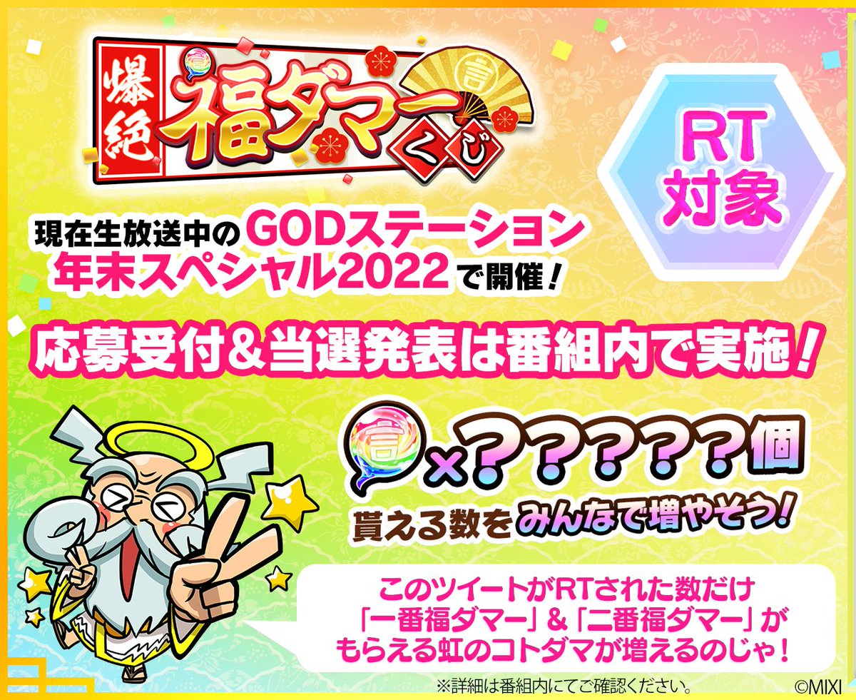 番組終了までにこのツイートがRTされた数だけ「一番福ダマー」「二番福ダマー」がもらえる虹のコトダマが増える✨